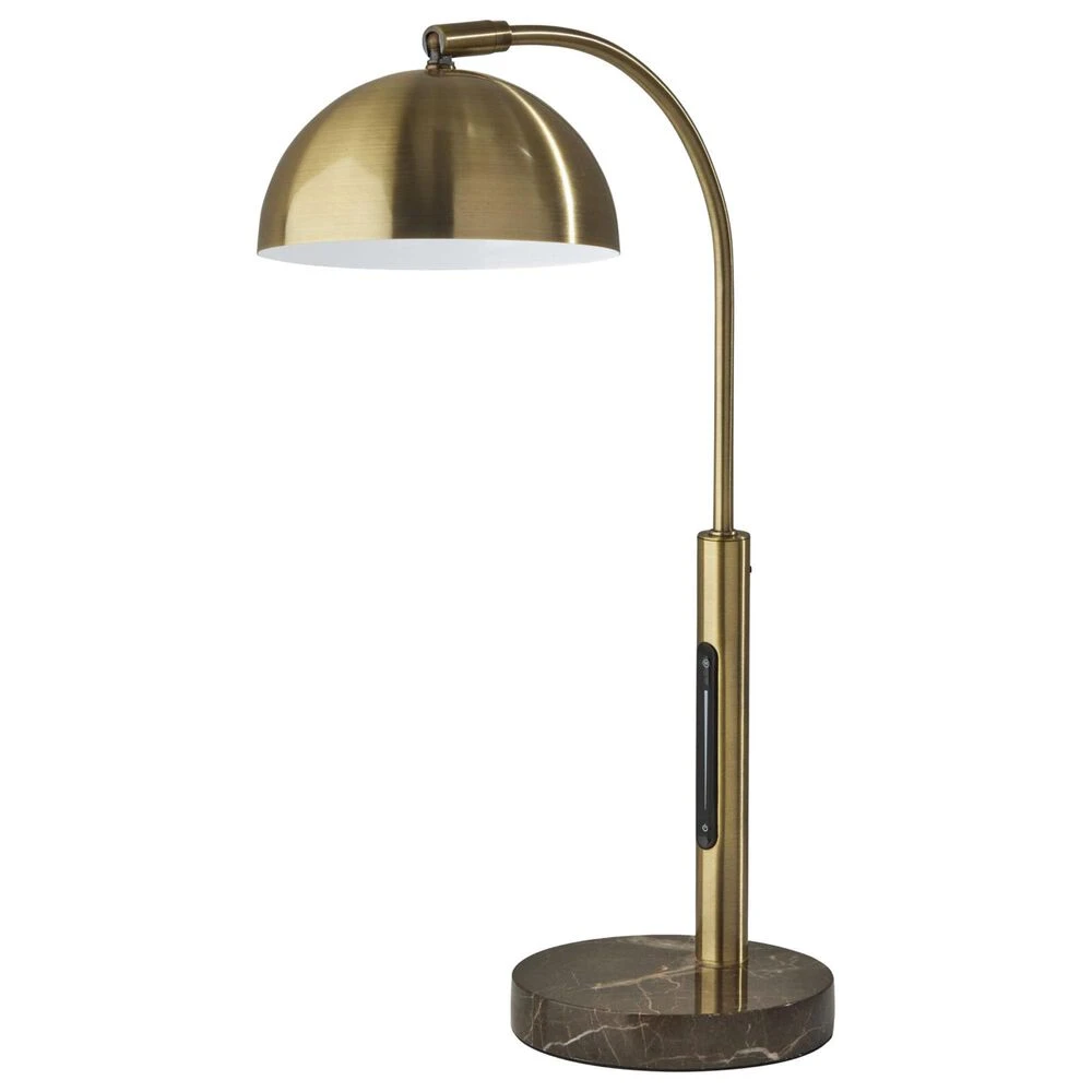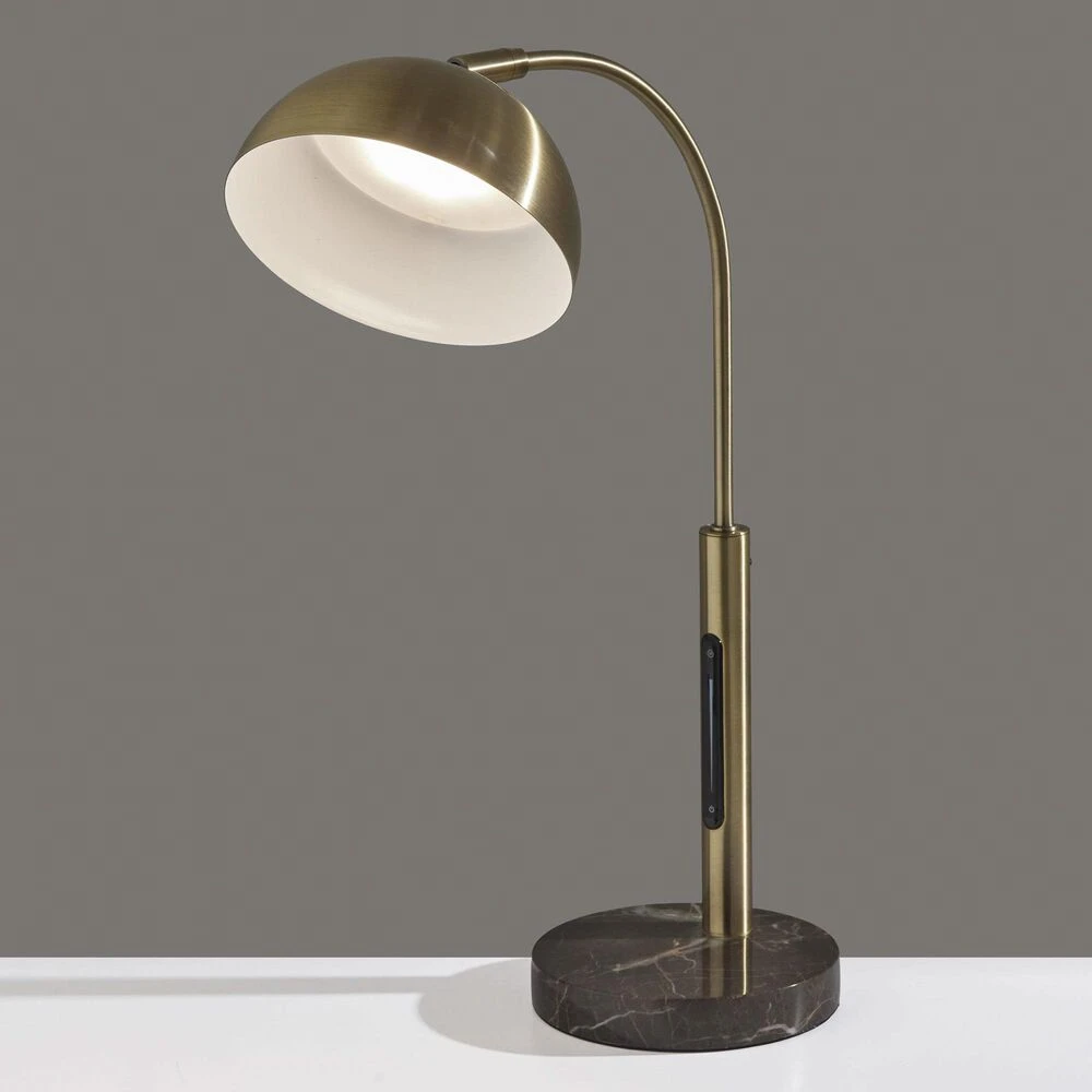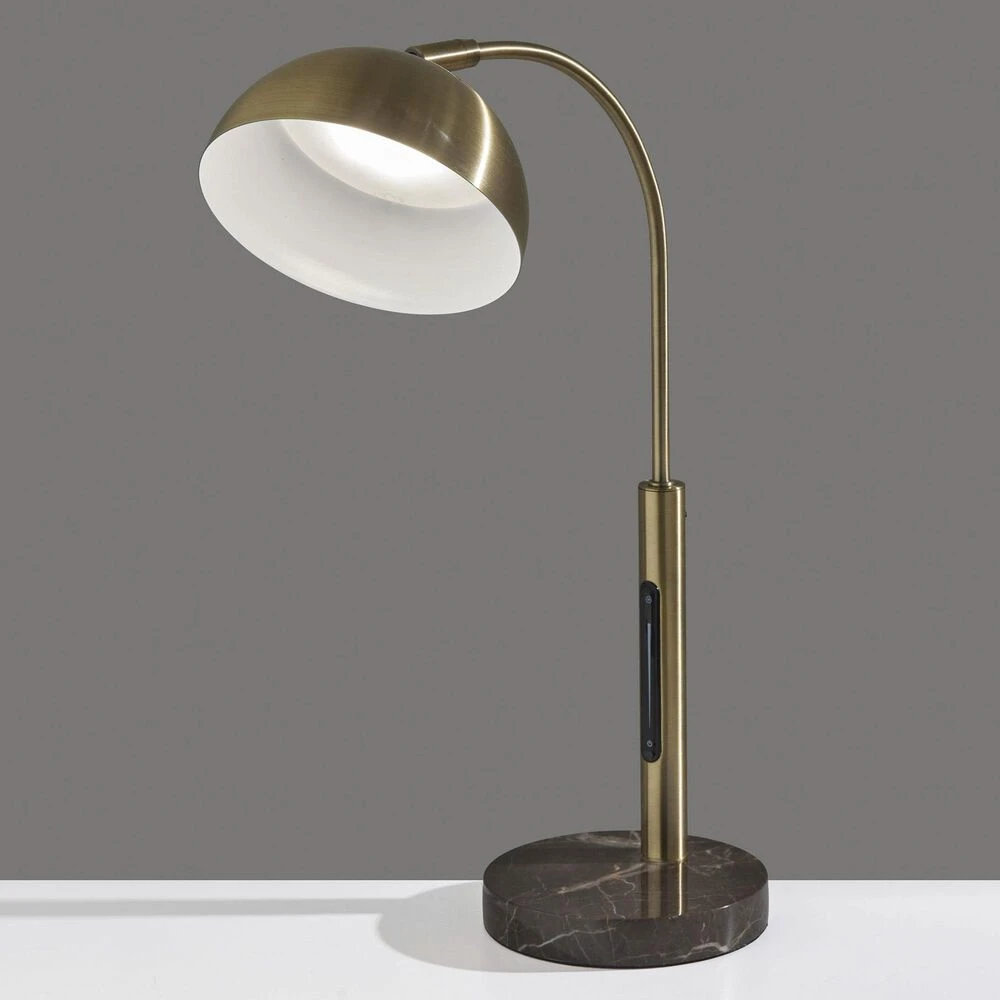 Displaying a modern silhouette and elegant blend of materials, the Bolton led desk lamp adds functional task lighting to your space. An antique brass pole and matching arcing stem are anchored securely by a 6” diameter round brown marble base. Topping the stem is a dome-shaped antique brass shade with an articulation point, allowing you to direct the light wherever it’s needed. A convenient touch switch located on the pole gives you full control of the lighting brightness and color temperature at the touch of a finger, while the integrated 6w led light is softened by a frosted diffuser.