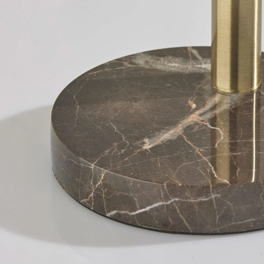 - A sleek antique brass finish is paired with a brown marble base for an elevated look