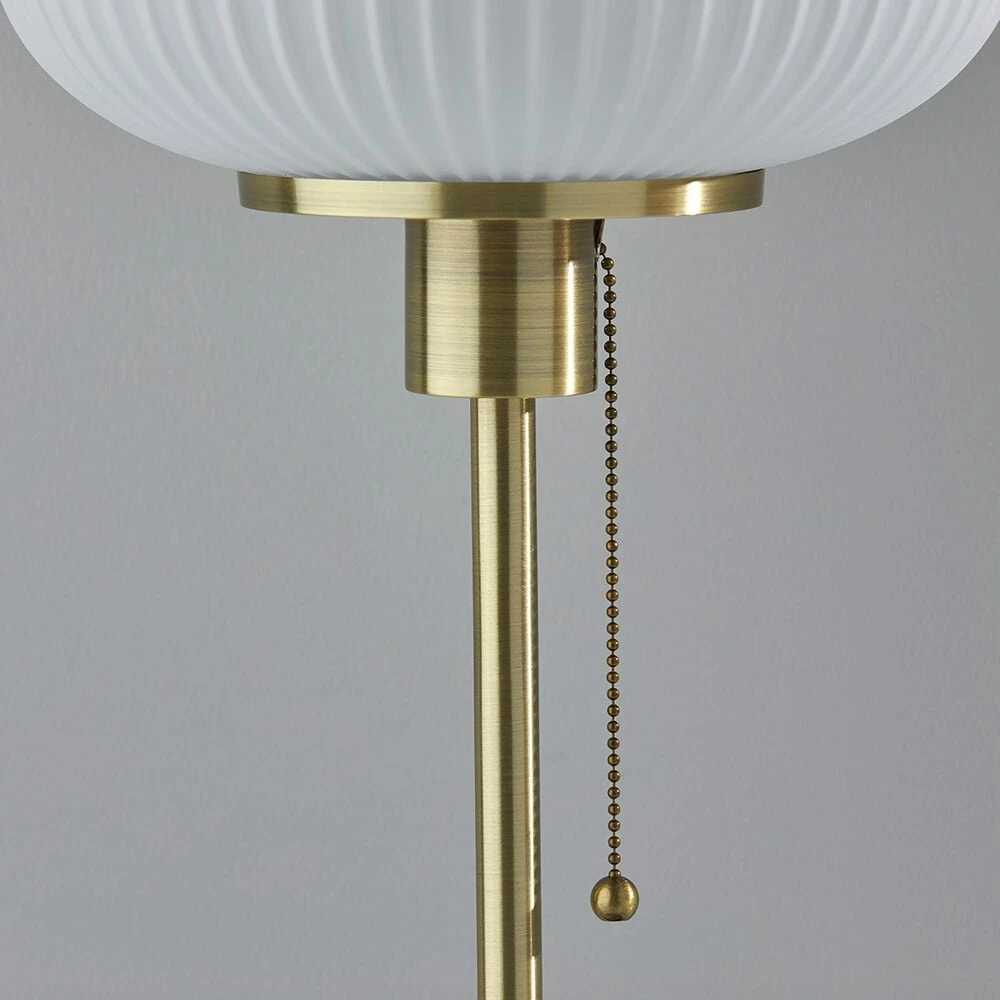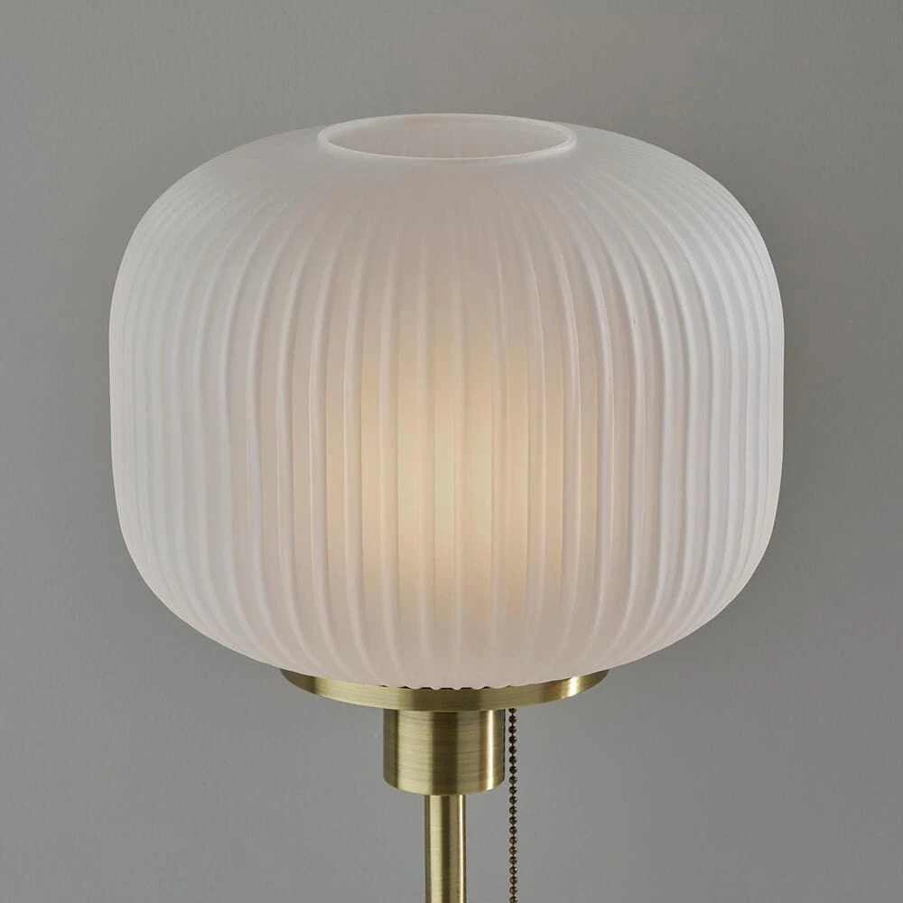 Add a classy touch of mid-century design to your space with the Hazel Table Lamp. A frosted ribbed glass shade emits a beautiful ambient glow when lit. Turn the lamp on and off with a convenient pull chain switch. An antique brass finish and a black base add to the clean, modern design. All Adesso lighting product is either UL or ETL listed, meaning that it has been tested and approved to meet the government-regulated safety standards for the USA.