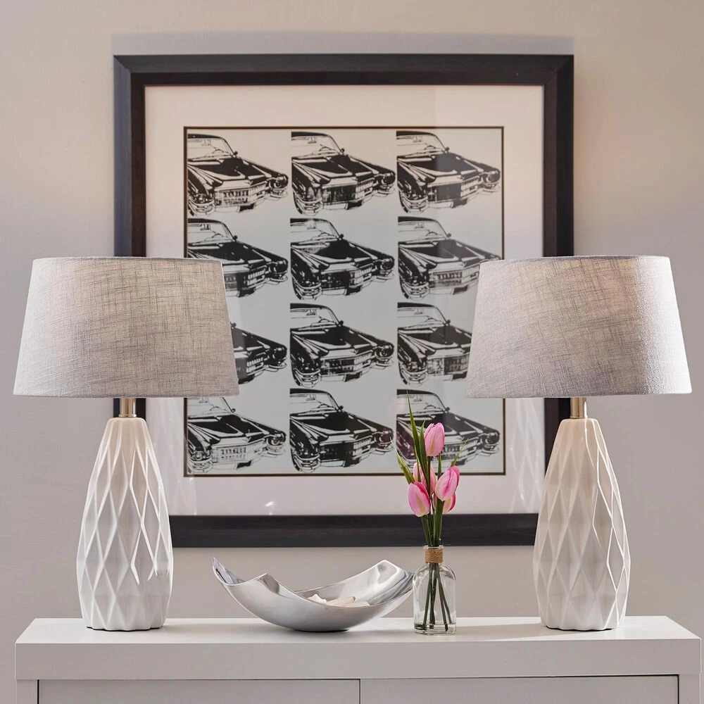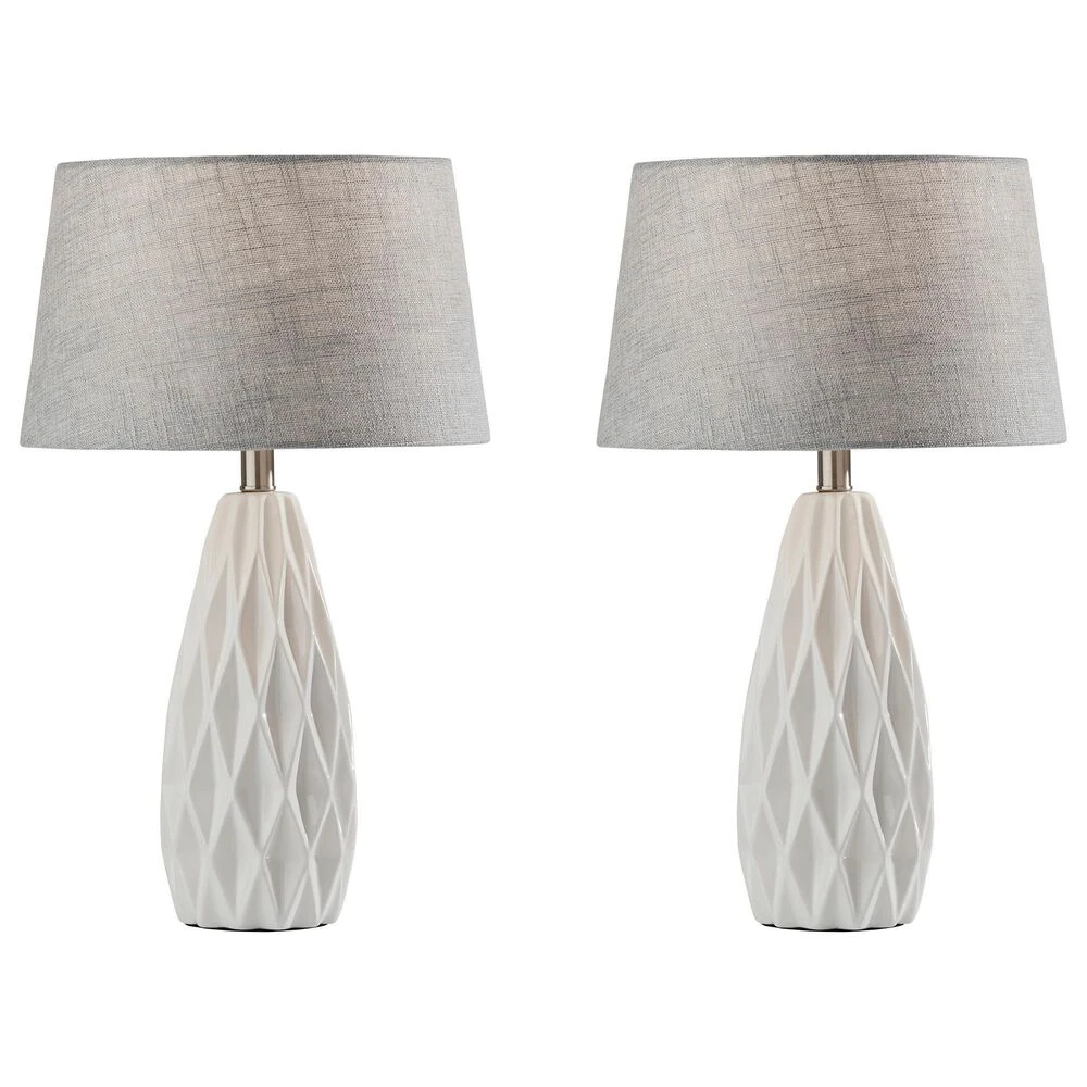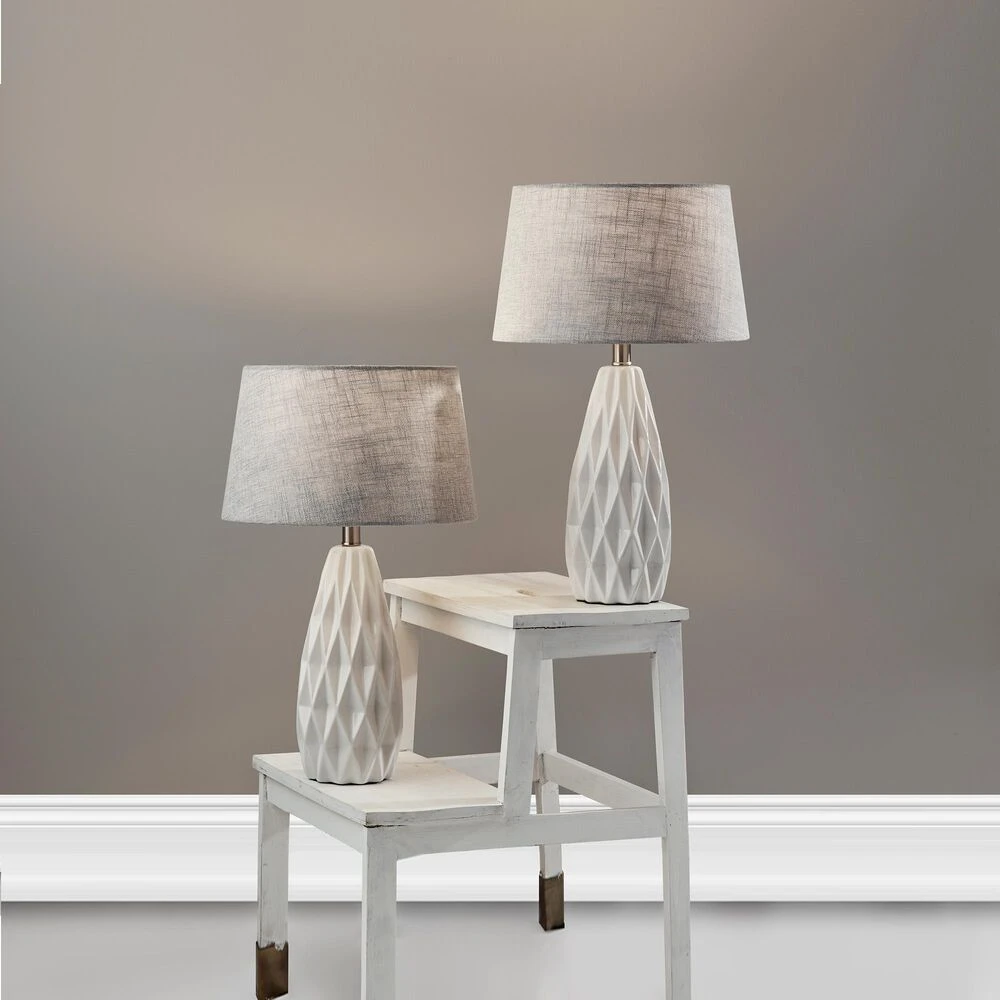 This functional and fashionable set of table lamps will liven up your console table or bedside. The white ceramic base has a unique geometric silhouette while the grey fabric shade reveals its beautiful texture when lit up. Turn the lamps on and off with a convenient switch on the socket. All Adesso lighting product is either UL or ETL listed, meaning that it has been tested and approved to meet the government-regulated safety standards for the USA. Bulb is not included.