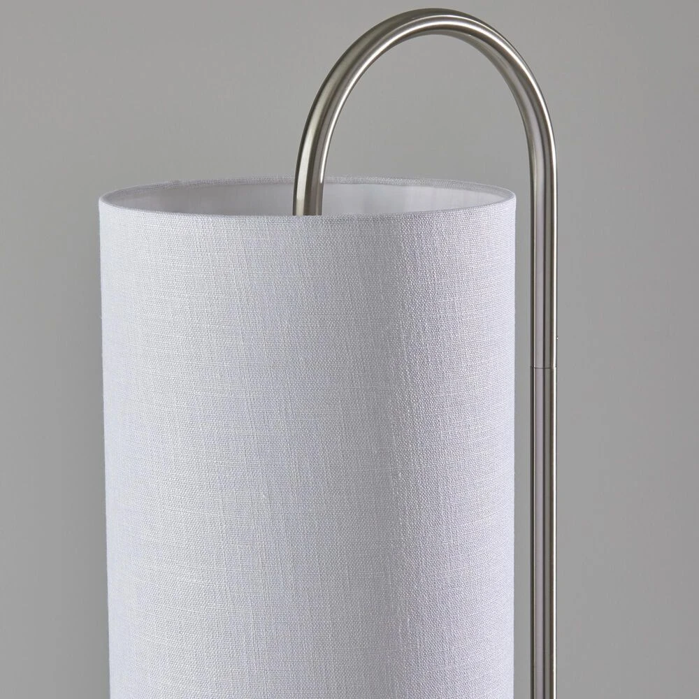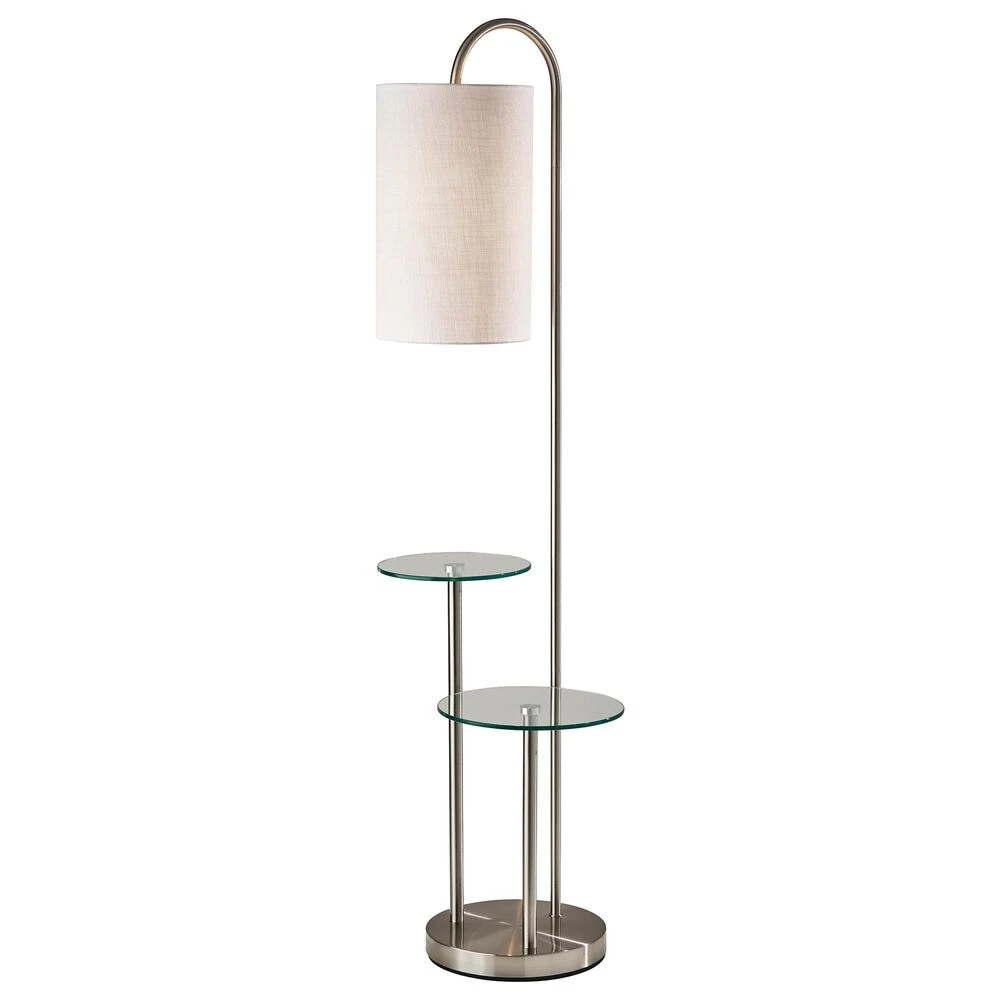 The ultimate space saving solution for beside the sofa, the Leonard Shelf Floor Lamp will provide 2 tiers of table storage space as well as decorative lighting with just a 20″ footprint. A brushed steel finish paired with clear glass table tops and a textured white fabric shade create a modern, upscale look. The 3-way rotary socket switch will only work with a 3-way light bulb, otherwise this lamp will function with simple on/off switch at its highest setting. All Adesso lighting product is either UL or ETL listed, meaning that it has been tested and approved to meet the government-regulated safety standards for the USA.