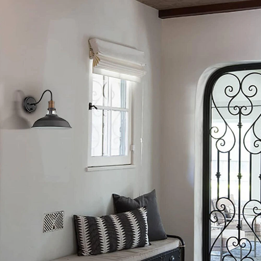 Crafted with solid metal, the farmhouse black wall sconce’s barn shade boasts a matte black finish on the outer surface while they flaunt a white finish on the inner surface, introducing an industrial-inspired style to your home decor. With a white interior to maximize reflectivity, the wall sconces liven up your interior with their brass lamp holders.