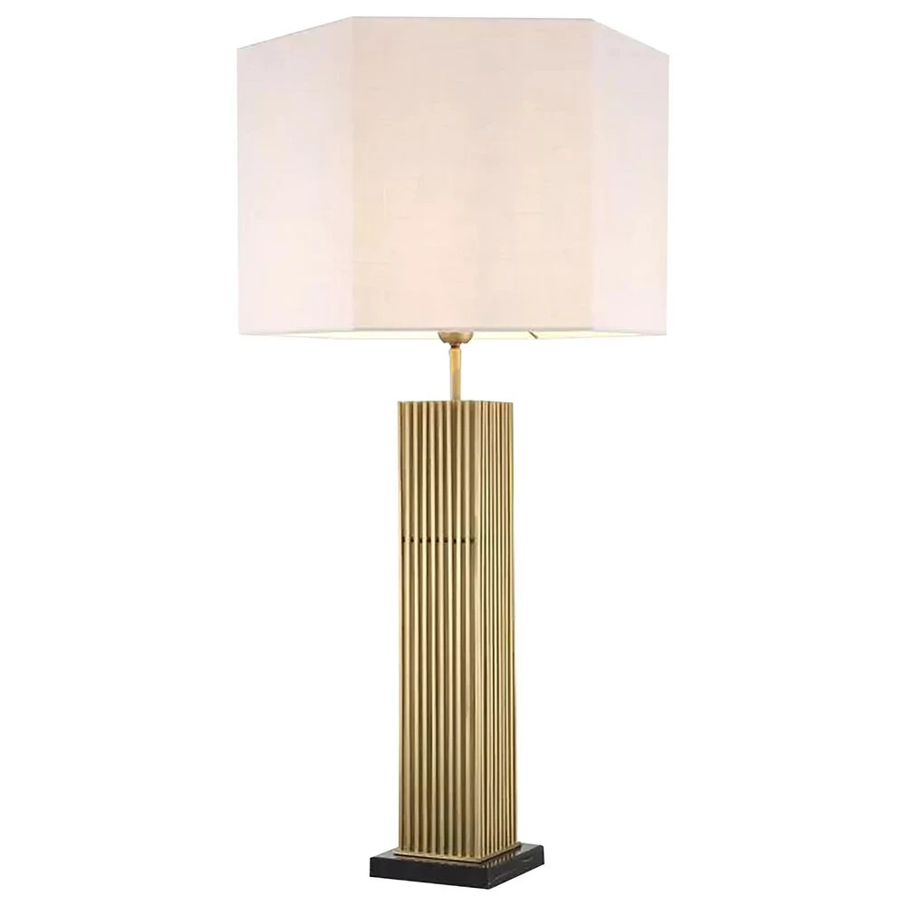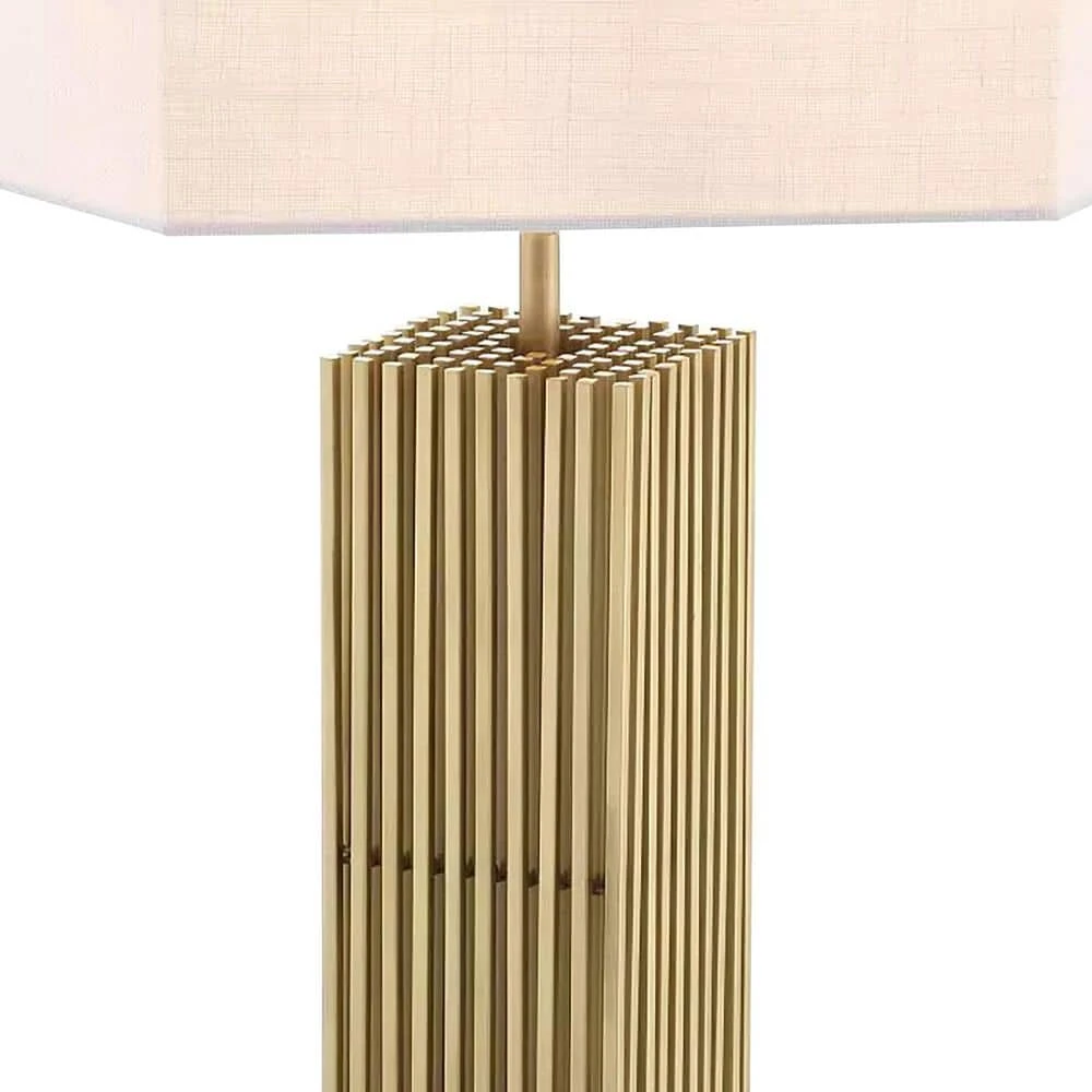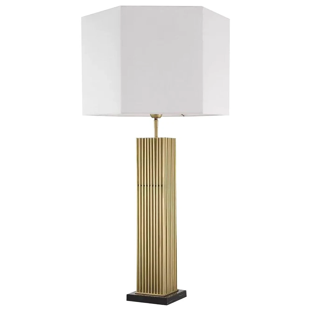 With no less than 96 solid square antique brass finish tubes mounted on a marble base, Table Lamp Viggo is a weighty lamp with a unique look. It is supplied complete with a hexagon white fabric shade which complements the shape of the base perfectly.