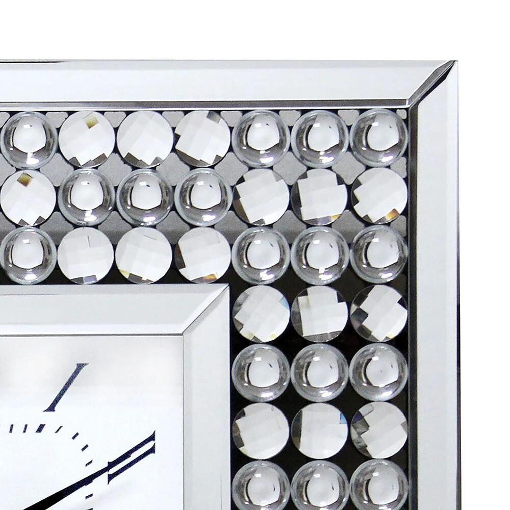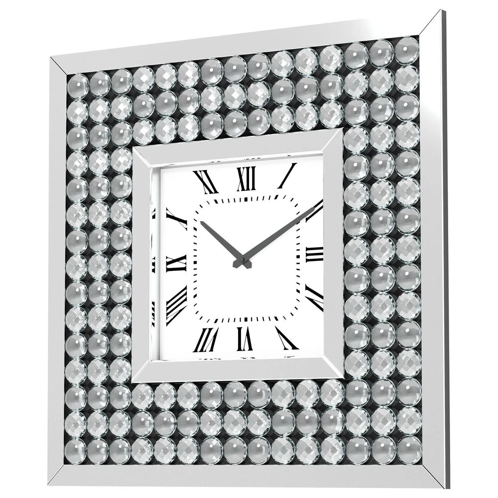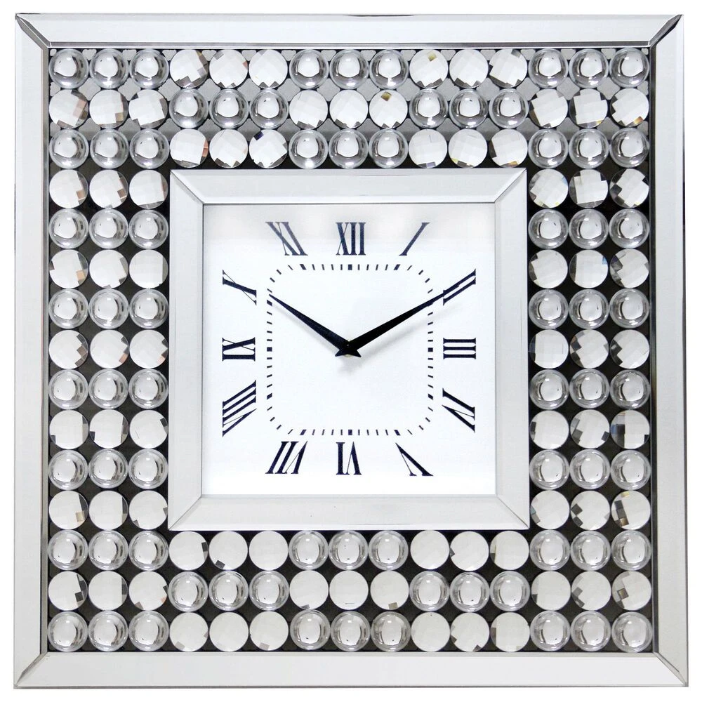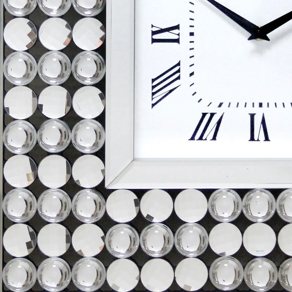 Glamourized with crystal accents, this contemporary wall clock is a dramatic addition in any room. It boasts a square profile with a wide frame in a silver finish. The clock face is high-contrast black and white with Roman numerals for a classic touch.