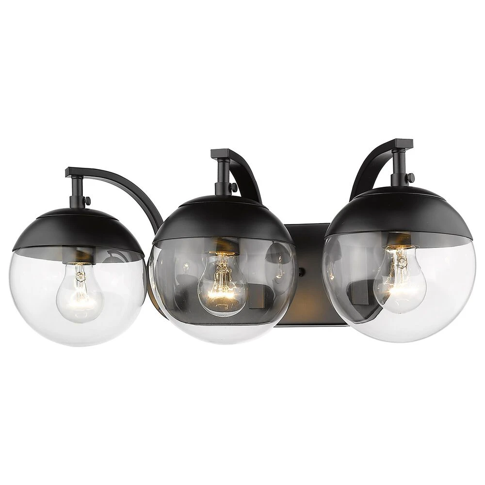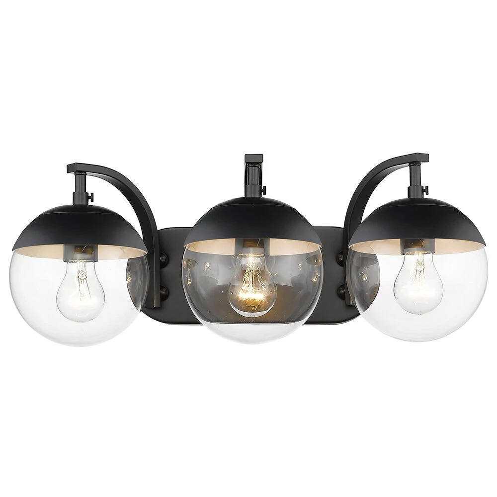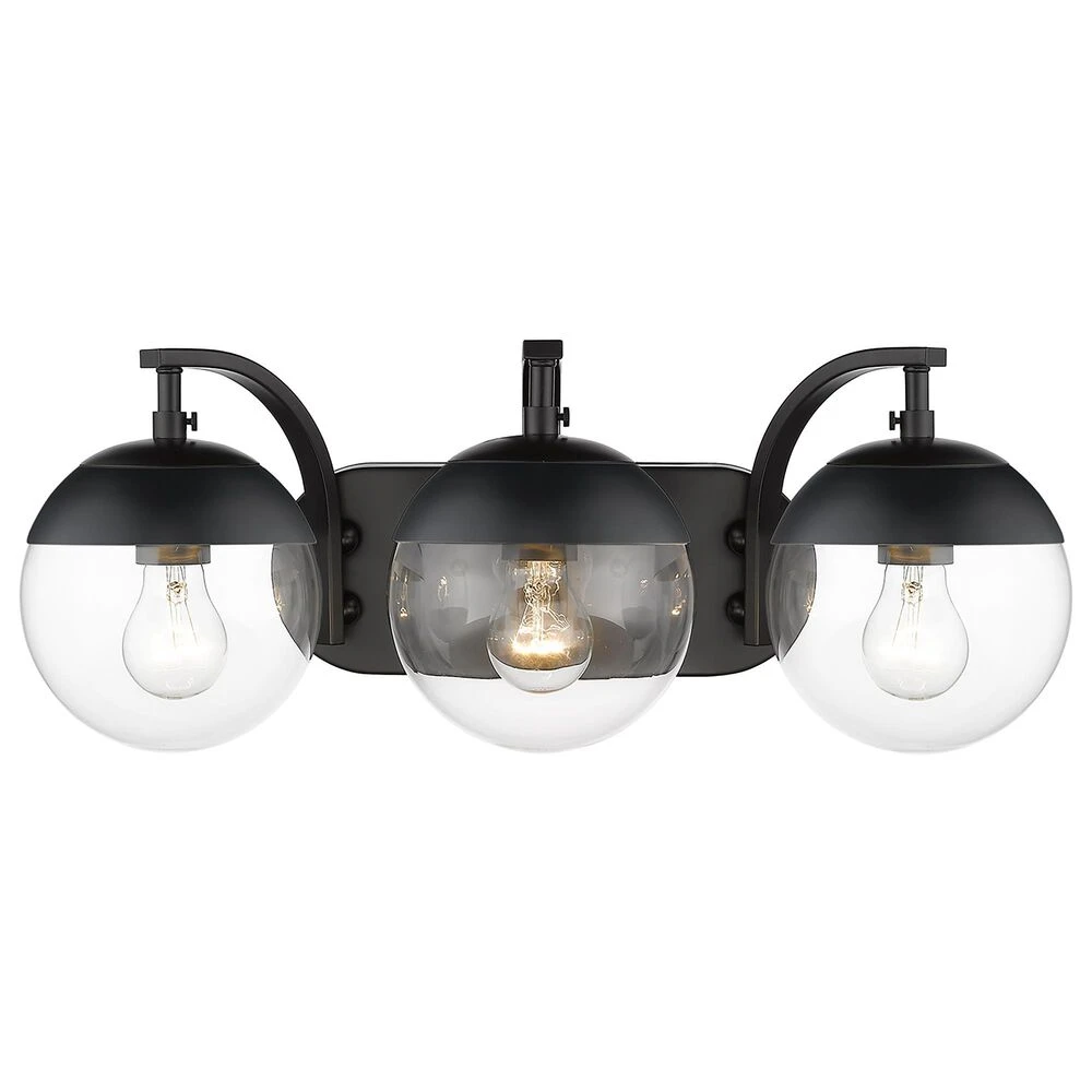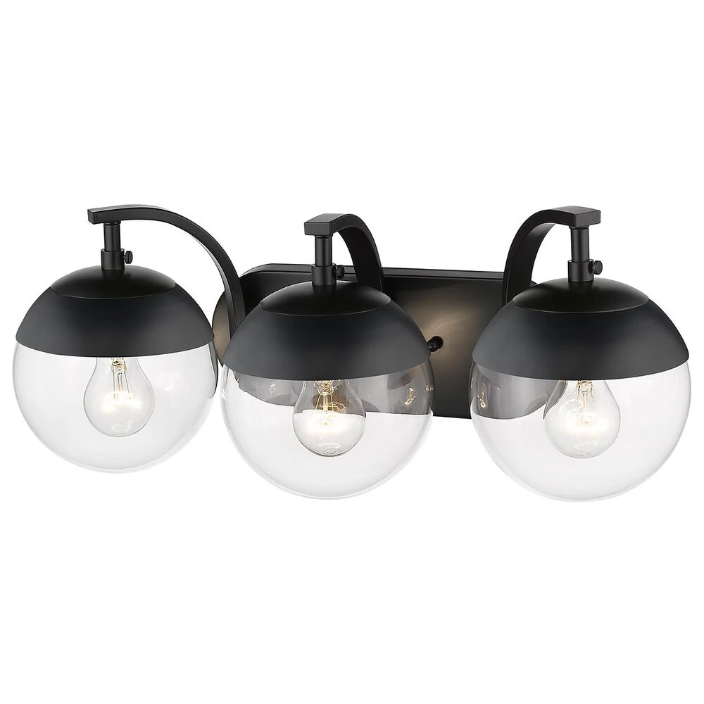 Mid-century modern design with a modern twist, these fashionable orbs are highly customizable. Available in clear or opal glass with plated chrome, pewter or brass or smooth matte black hardware. Caps are available in a number of accent colors to further customize your look. Choose colors and finishes that complement your existing decor or design your entire room around your favorite color combination. This 3-light bath vanity is damp rated for use in the bathroom.