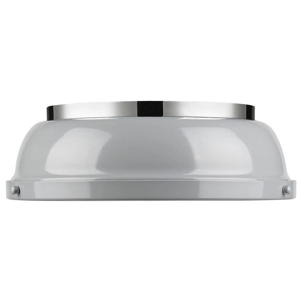 Transform the look of your room with this classic, vintage-inspired fixture, the Duncan collection is contemporary style with an industrial feel. The collection features a variety of simple, traditional silhouettes that are a nod to a bygone era. The Rubbed Bronze fixtures are paired with Rubbed Bronze shades. This flush mount is perfect for modern or contemporary style home decors. It works perfectly in a kitchen, hallway or bath and is UL approved for damp locations. This shiny chrome flush mount is paired with a gray shade. The shade is a soft, glossy medium gray .