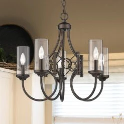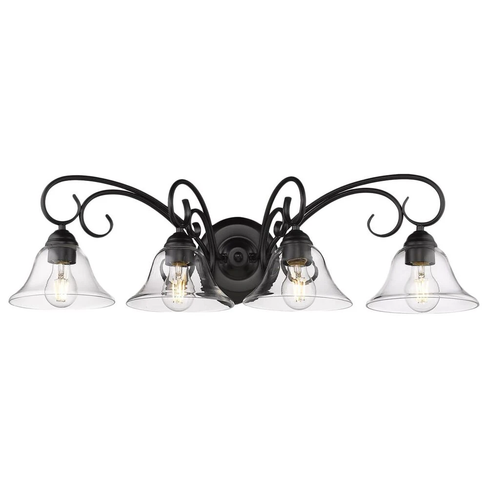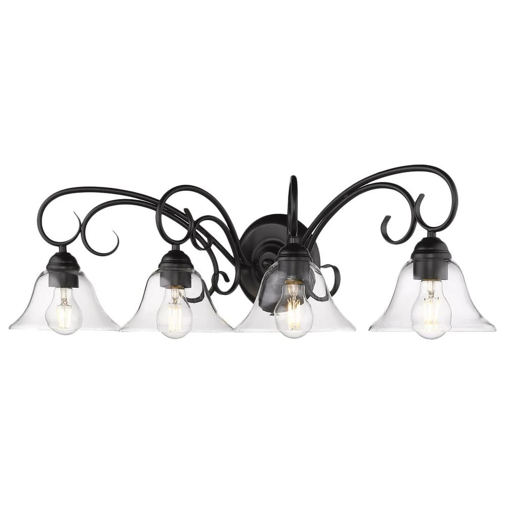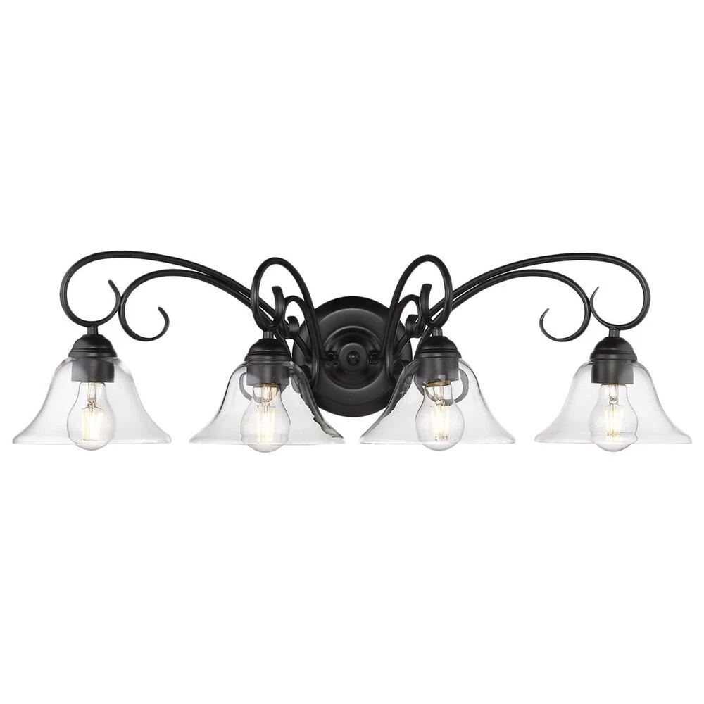 Earthy tones and organic lines make Golden Lighting’s Homestead collection a comforting addition to the transitional style home. Whether the decor is eclectic, casual, or even traditional, Homestead pieces blend well in cozy environments. The rich Rubbed Bronze finish gives depth and weight to the delicately curved arms, and the warm Tea Stone Glass partners perfectly to create a rich effect. This 4 light bath vanity is UL approved for damp locations and is ideal over a vanity or mirror.