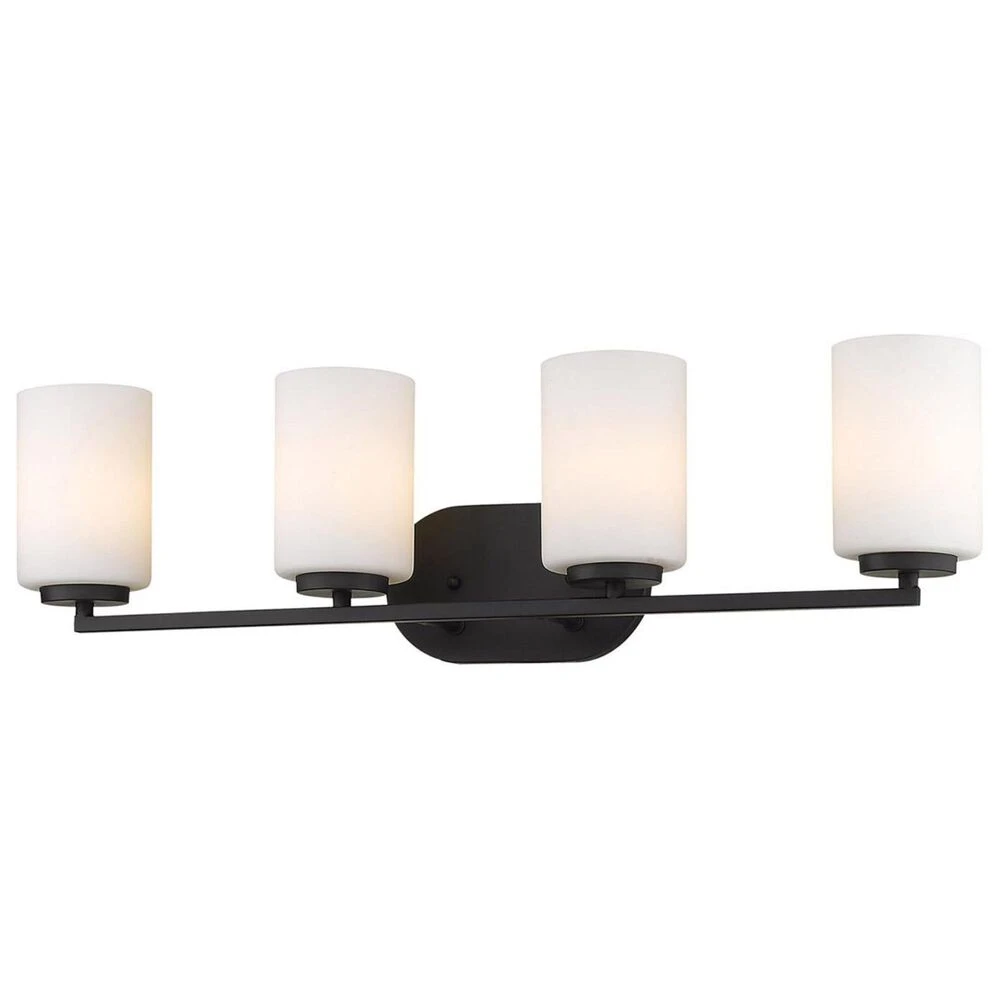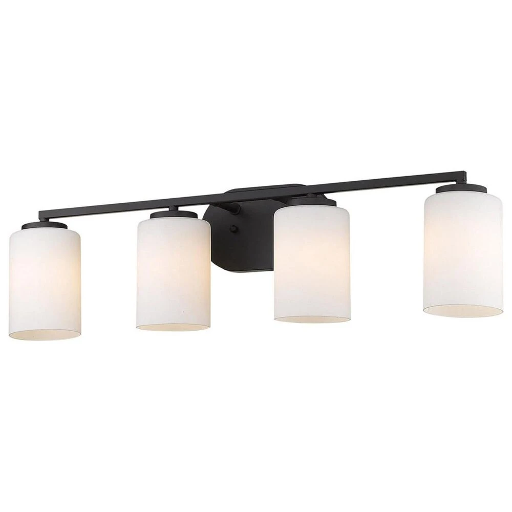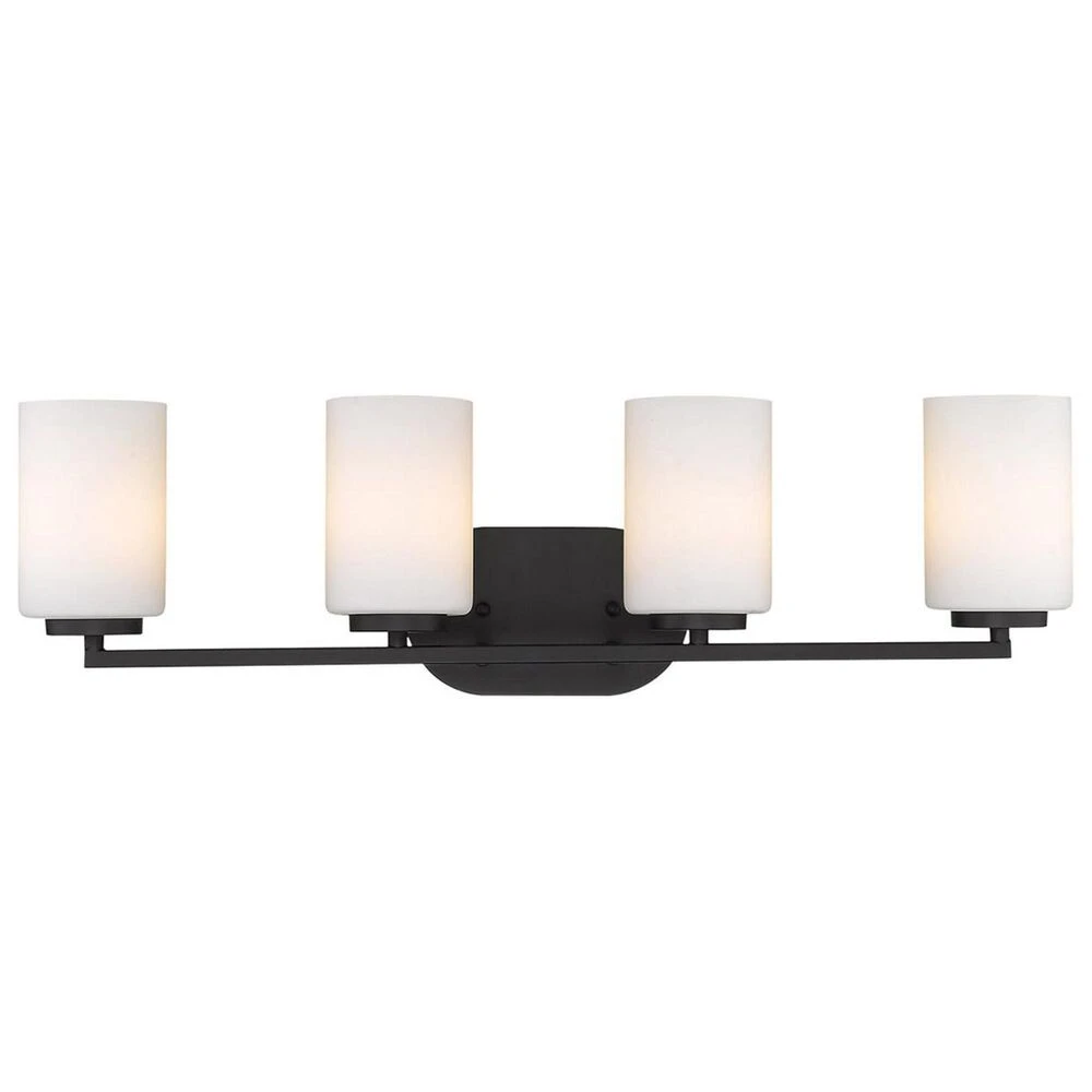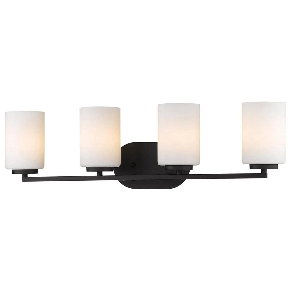 This simple and versatile look is at home in transitional to modern settings. The smooth, matte black finish adds a contemporary feel. The neutral white shade dresses up the look, while softening the geometric lines and gently diffusing the light. This fixture may be mounted with the glass facing up or down. This 4-Light bath vanity is UL approved for damp locations.
