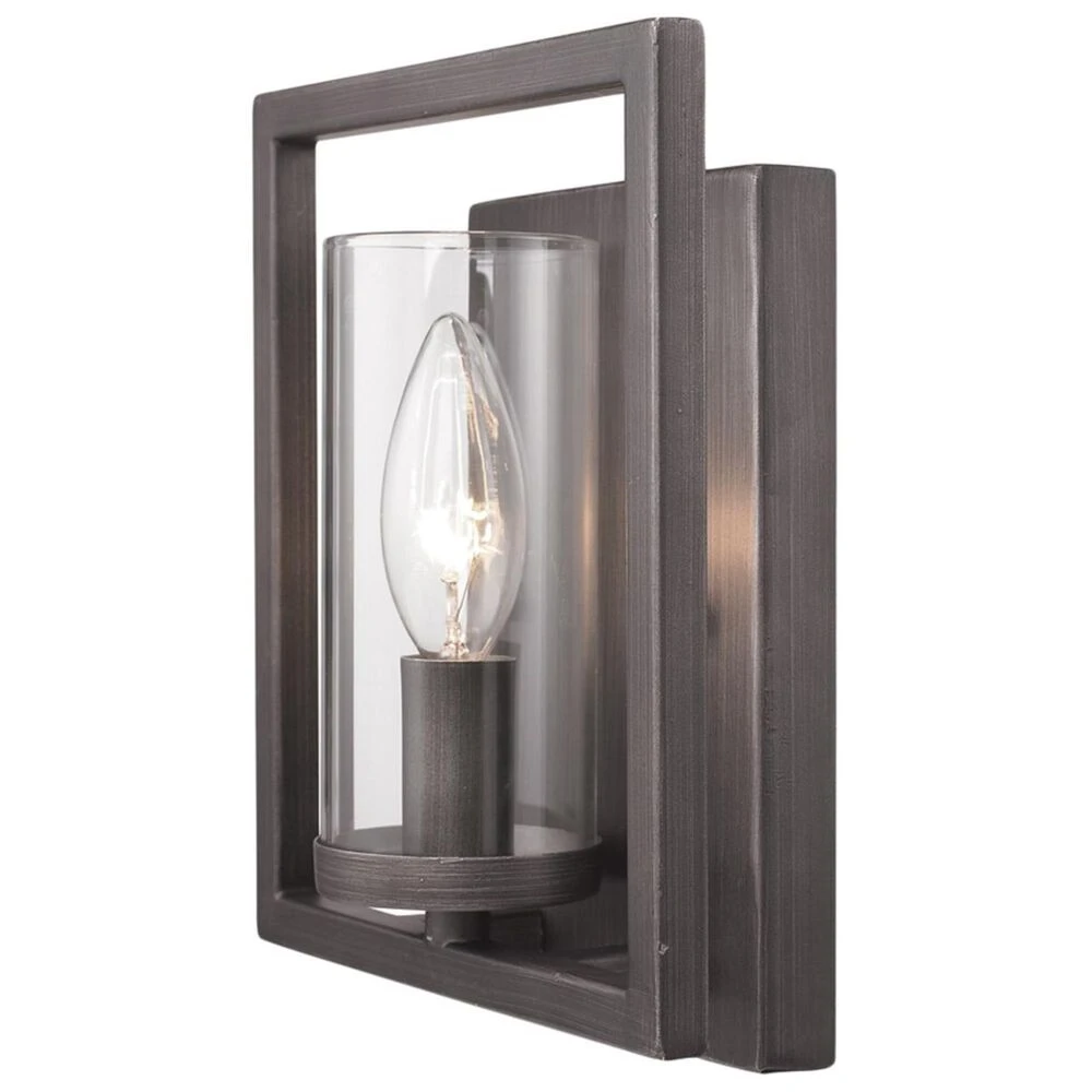 Sleek angles, pure geometry, and industrial finishes synergize to make an ultra-modern statement in Golden Lighting’s Marco collection. A striking Gunmetal Bronze finish gives warm undertones to the bold square frames, while a Clear Glass cylinder surrounds the stately silhouette of the candelabra bulb. This sconce can be used in a hall, stairway, or foyer as an accent. It can be hung individually or as a pair.