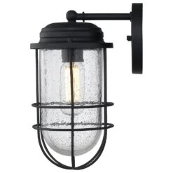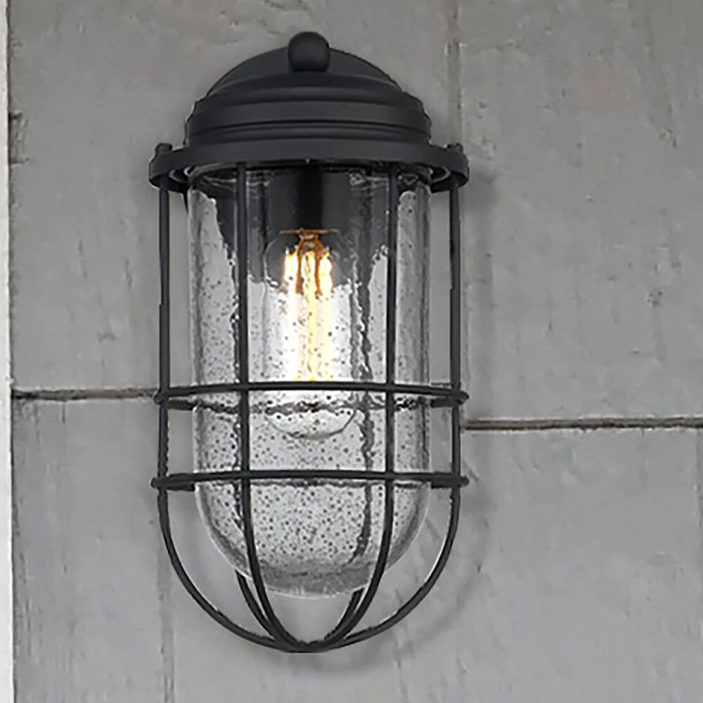 Nautical-inspired, Seaport is a collection of industrial fixtures to create your seaside retreat. Offered in a textured natural black, the New England style is enhanced by protective cages and seeded glass that shield the fixture’s bulbs. This outdoor fixture is wet rated and is UV-coated to protect it from fading.