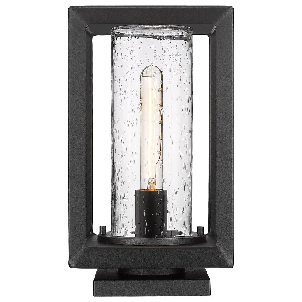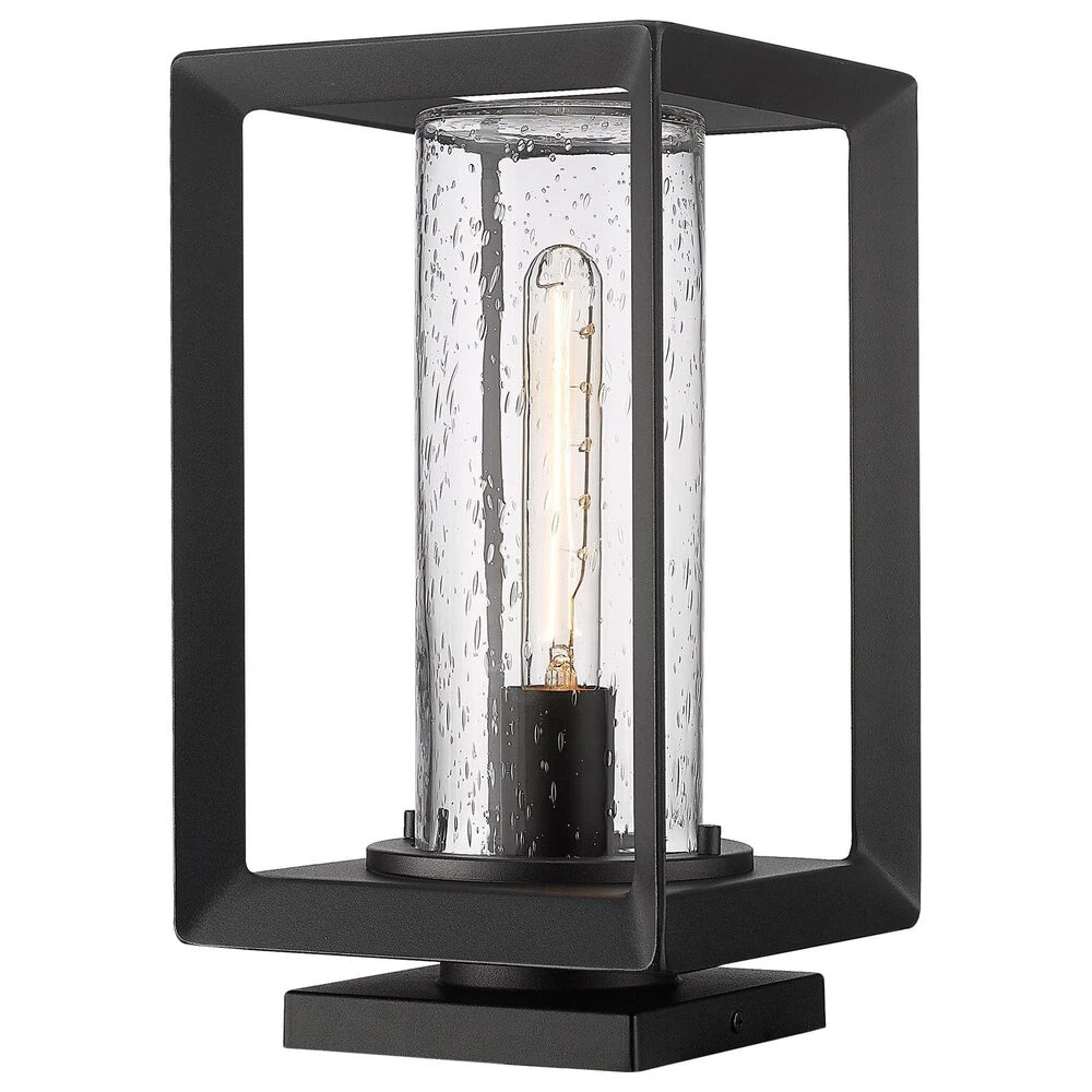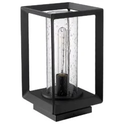 Modern lanterns featuring a handsome beveled cage design make an elegant statement in the Smyth Outdoor collection. Clean geometry creates a contemporary style. These wet-rated, open-cage fixtures are offered in a textured Natural Black finish with two glass options: Seeded or Opal. Smyth is an extensive collection that includes wet-rated options with a UV-coated layer to prevent fading.