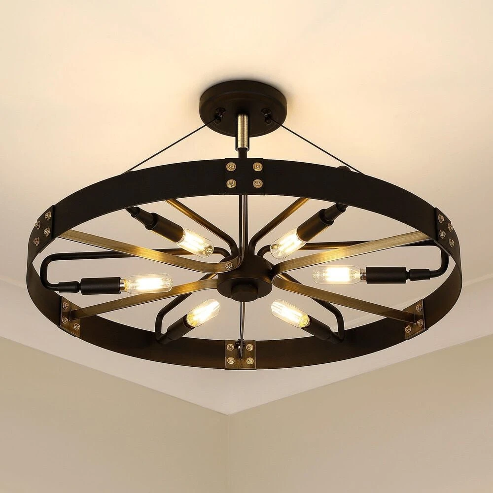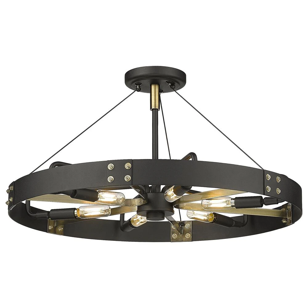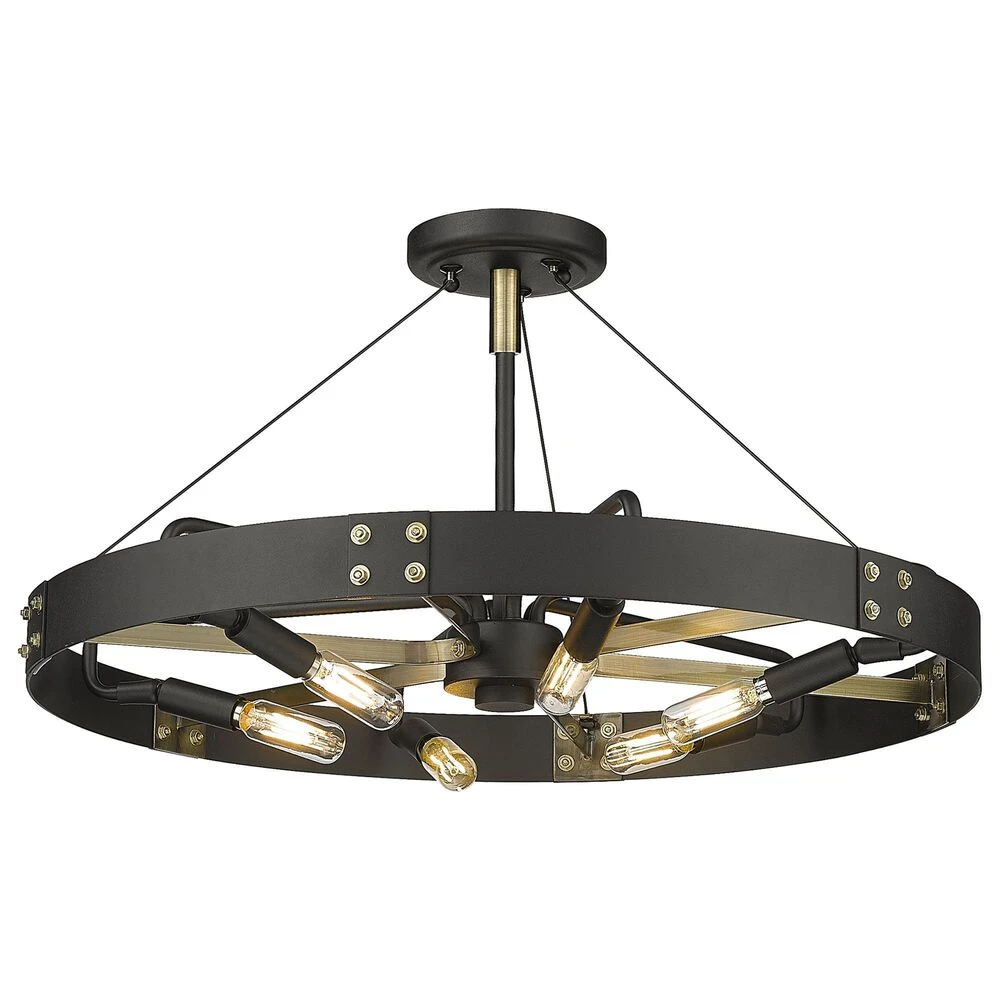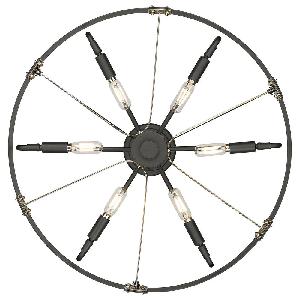 Industrial by nature, Vaughn fits well in contemporary homes. Inspired by the spokes of a vintage wagon wheel, this collection brings antiquity to the modern age. The Natural Black finish is slightly textured and adds drama to this focal series. Select a monochromatic version or elevate the look by selecting a fixture with contrasting aged brass accents. Pivoting sockets and steel cables act as additional features to the bold design.