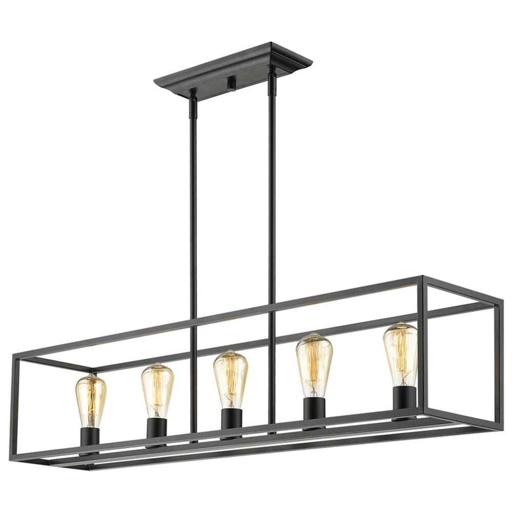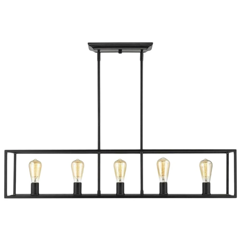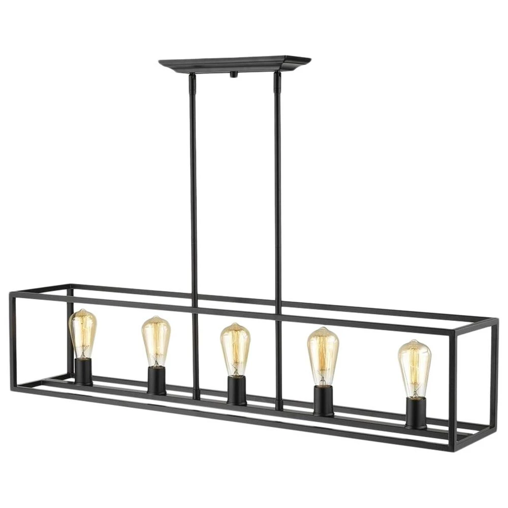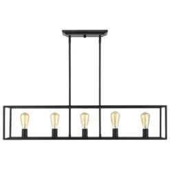 Wesson is a clean contemporary collection with a smooth black finish. The industrial look is enhanced by the exposed medium-based bulbs inside the square tubing of the open, geometric cages. Complete the modern, rustic look by installing Edison Bulbs. This 5-light linear pendant perfectly illuminates an elongated bar, dining table, or kitchen island.