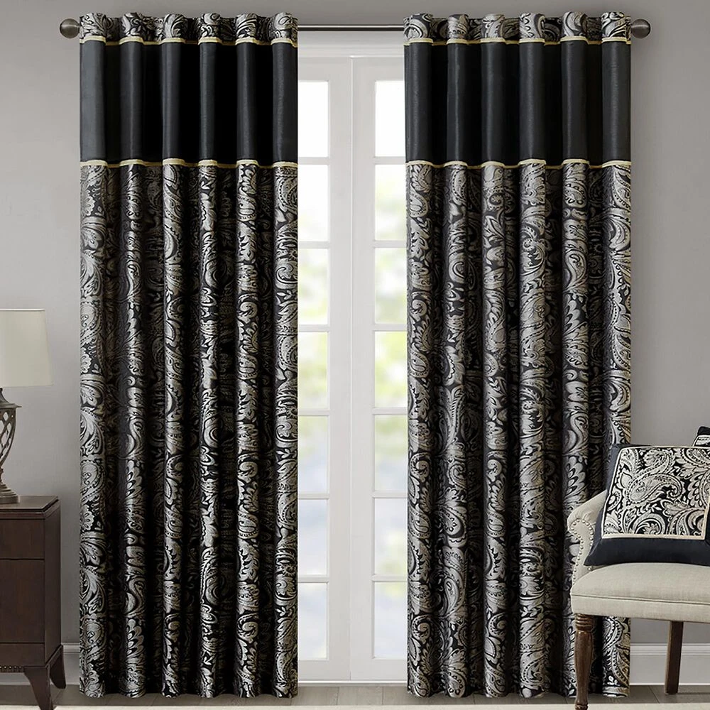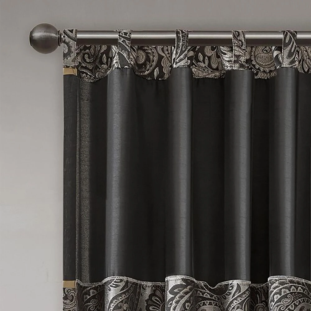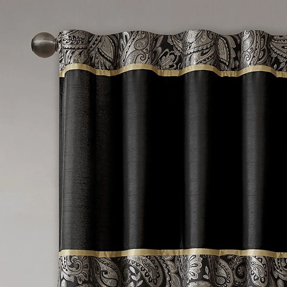 For a luxuriously classic style, our Madison Park Aubrey Window Curtain Pair is the perfect touch to your decor. The alluring jacquard weave is inspired from an updated paisley motif and is woven in beautiful hues of black, gold, and a hint of platinum for a shimmering accent. The window panels are pieced with solid faux silk and beautiful flat piping details in gold, creating an elegant look. While also achieving the OEKO-TEX certification, meaning it does not contain any harmful substances or chemicals, ensuring quality comfort and wellness. Rod pocket or back tabs top finish makes this curtain easy to hang, open, and close panels throughout the day; while fitting up to a standard 1.25″ diameter rod.