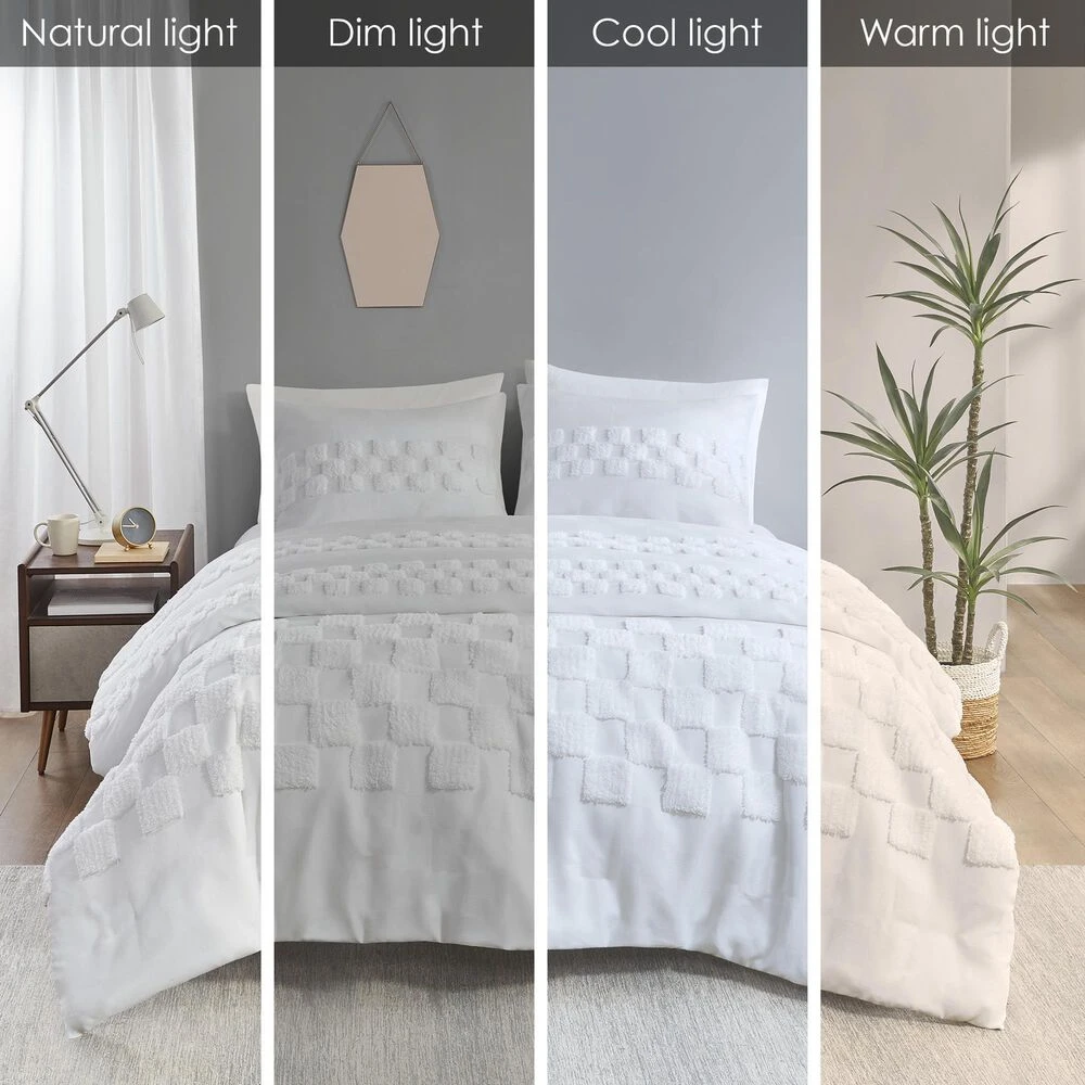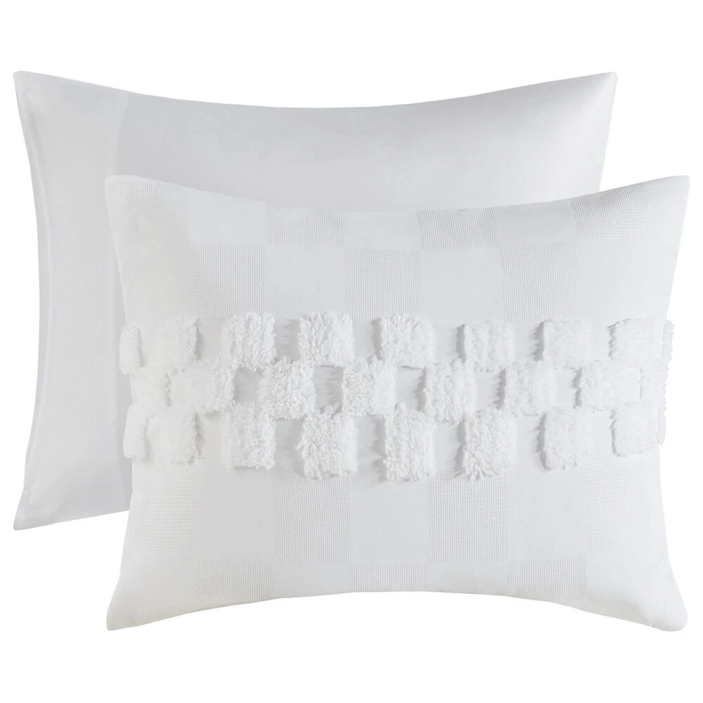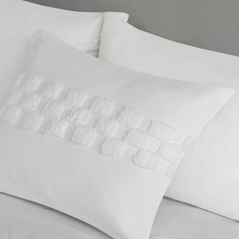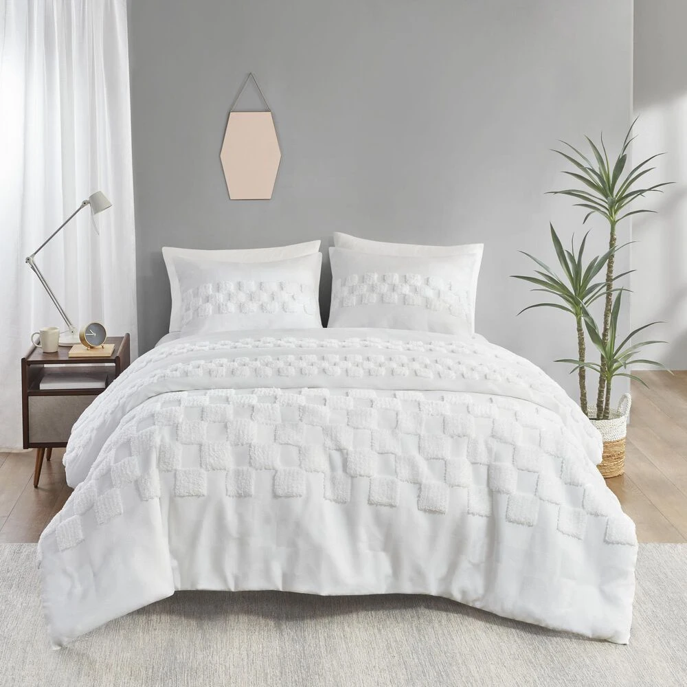 The Bennett duvet cover set features a unique checkered pattern with clipped chenille for a modern, sophisticated look. This off-white duvet cover adds a contemporary update to your bedroom, while coordinating shams complete the bedding set. This duvet cover set is also machine washable for easy care. Inserts for duvet covers are sold separately.