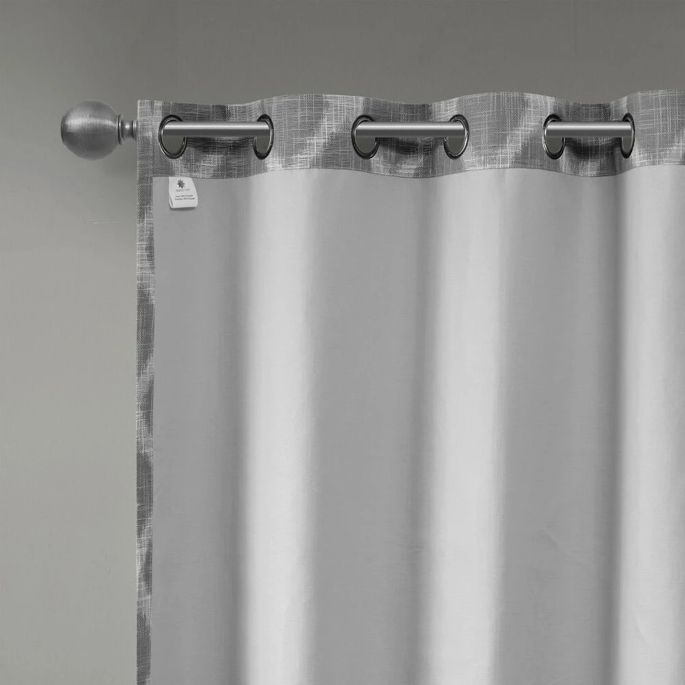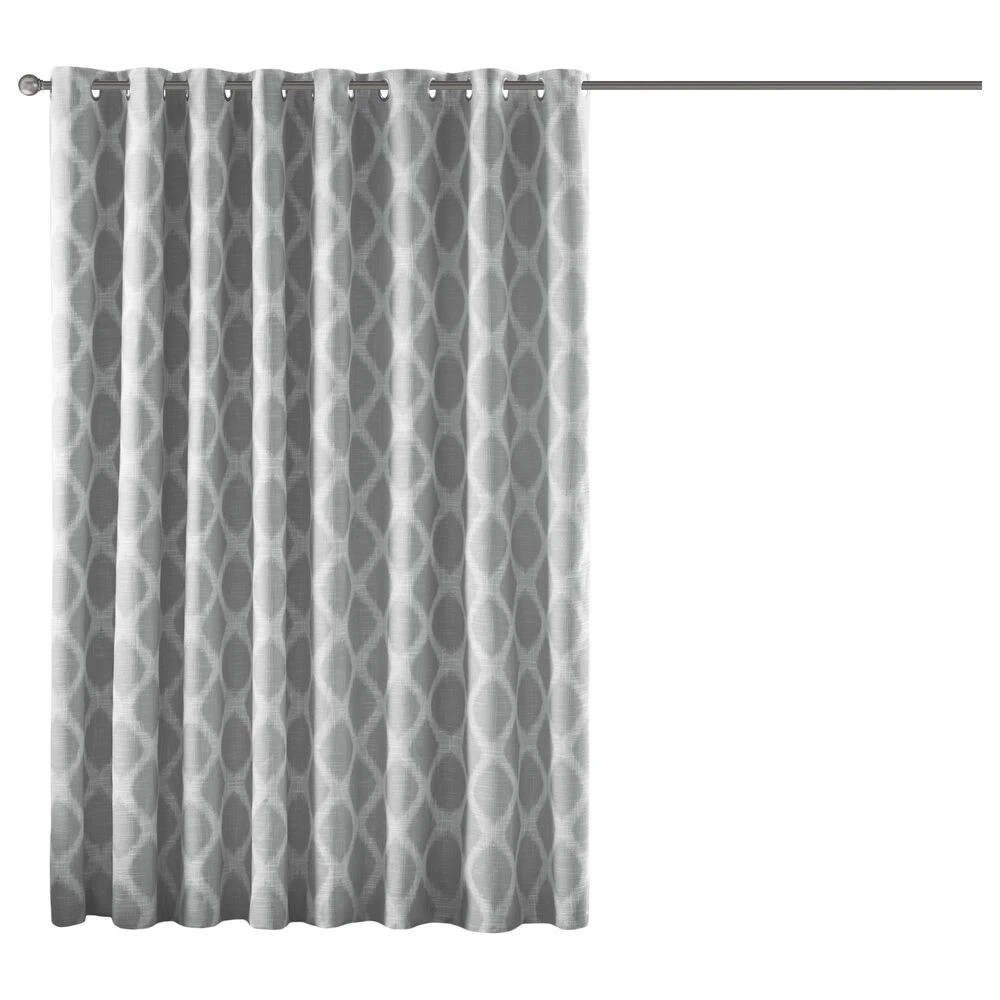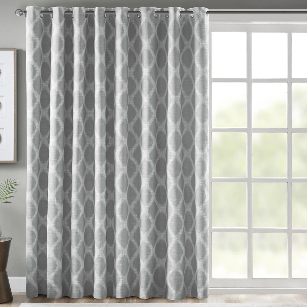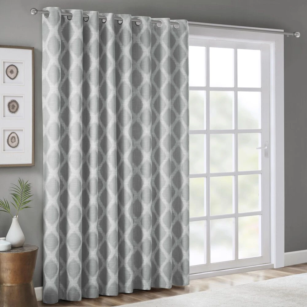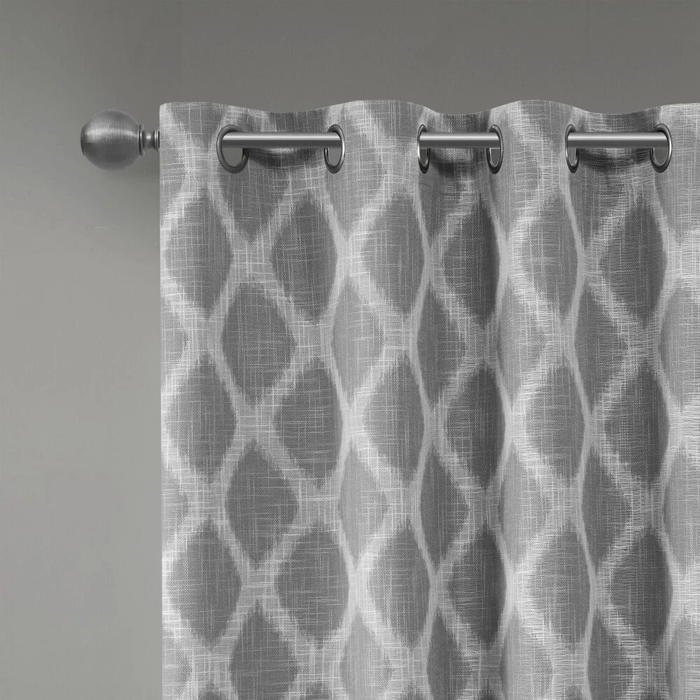 Introducing a modern and stylish take on energy efficiency, our SunSmart Blakesly Printed Ikat Blackout Panel is the perfect update to any room. Chic and charming, this window panel features a printed grey ikat design on a textured base fabric, creating dimension for a cool and casual look. Finished with a one pass foamback and bonding technique, the panel is enhanced to block most sunlight and create a significant barrier to reduce outside noise. Silver grommet top detail makes it easy to hang, open, and close panels throughout the day; while fitting up to a standard 1.25 diameter rod. With considerable energy savings and a high level of added privacy, this blackout panel is perfect for home offices, family rooms, and bedrooms. Give your space a beautiful, one-of-a-kind update with this contemporary blackout window panel. Lighting level: Heavily Shaded Ambiance.