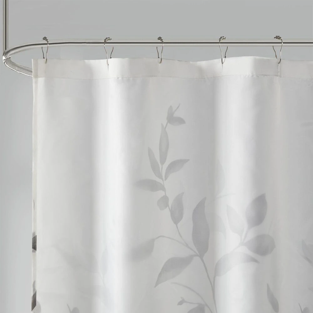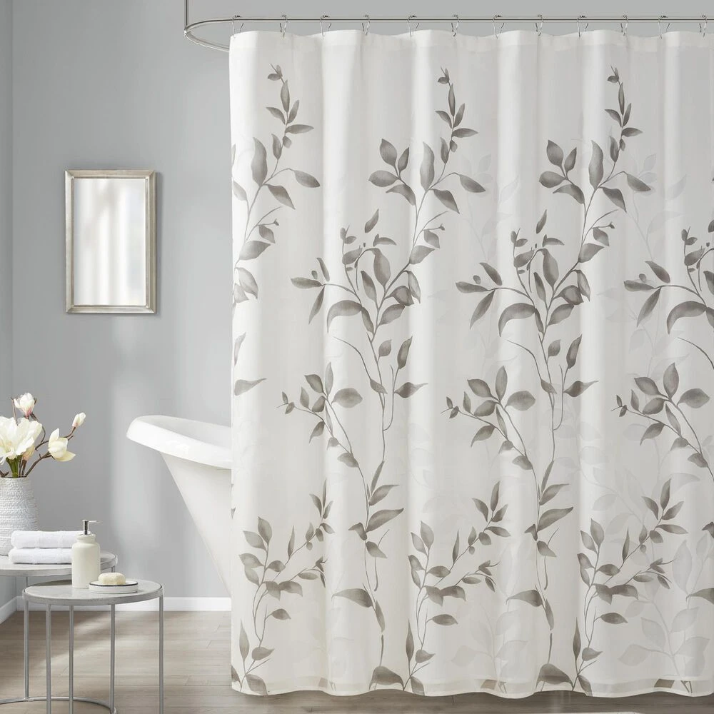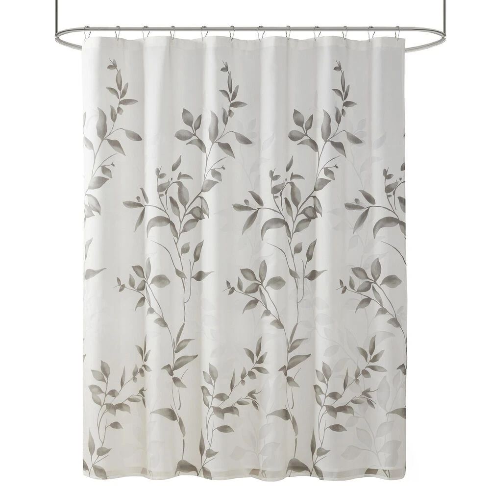 Transform your bathroom with the beauty of Madison Parks Cecily Printed Shower Curtain. The gorgeous shower curtain flaunts a stunning allover grey botanical design with burnout detailing for beautiful contrast and dimension. Non-absorbent water coat will help to bead water on fabric and glide down which provides quick dry and keeps fabric looking tidy, separate liner is still recommended and can be purchased seperately. Machine washable for easy care; Each shower curtain measure 72″x72″ and is finished with 12 button holes at the top making it easy to hang; hooks and rod are not included and will need to be purchased separately. Complete the look with coordinating Window panel, available and sold separately.