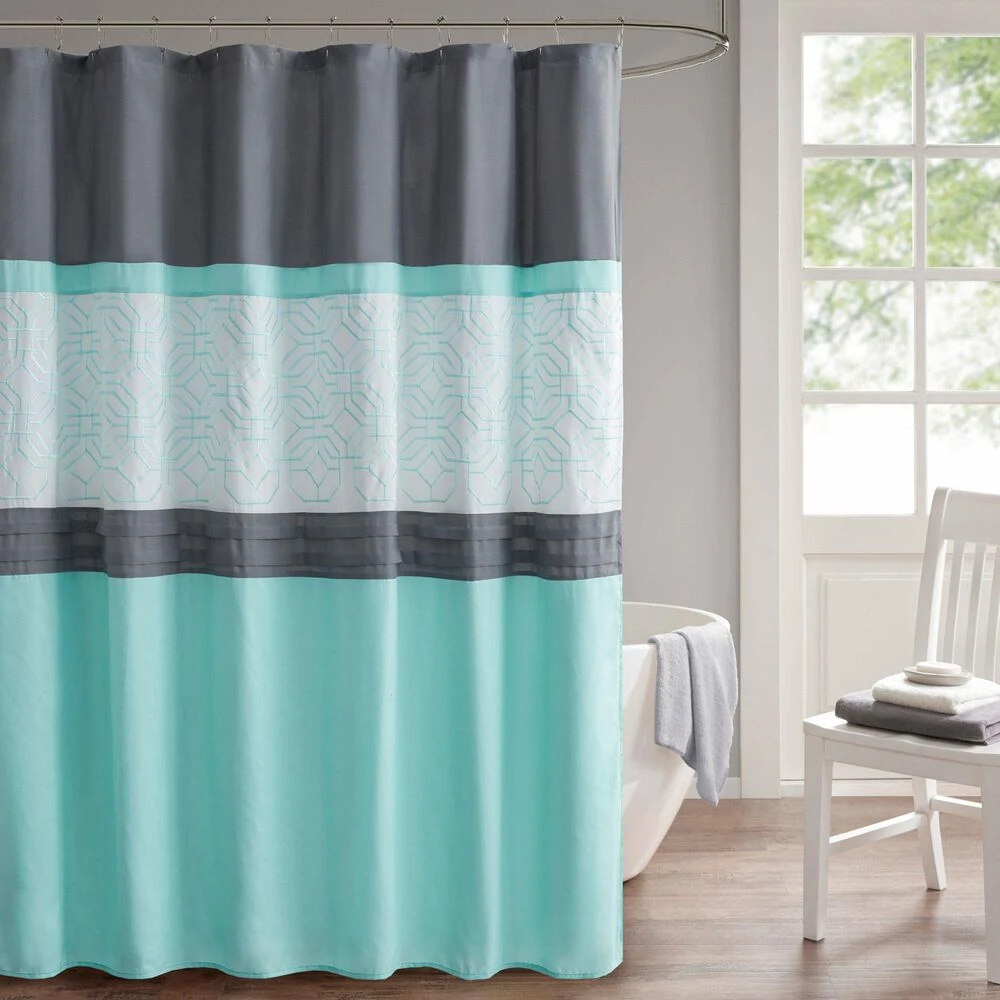 The 510 Design Donnell Embroidered and Pieced Shower Curtain offers a fresh update to your bathroom. A pintucked and pieced design is featured in grey and aqua hues, for a simple updated look to your decor. An embroidered geometric design adds texture and dimension, while an added lining provides better drapability and an extra layer of privacy. Made from soft microfiber, this pieced shower curtain brings a refreshing touch to your bathroom decor.