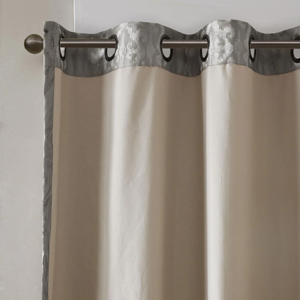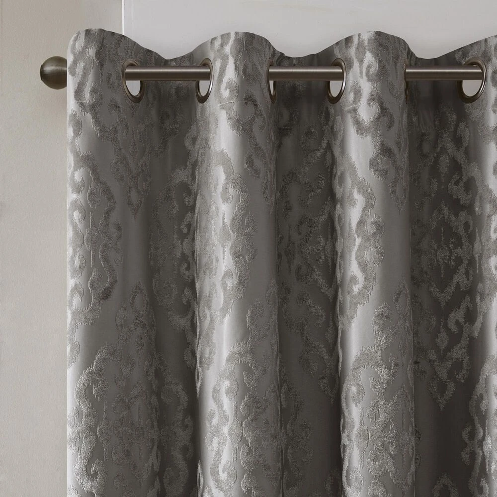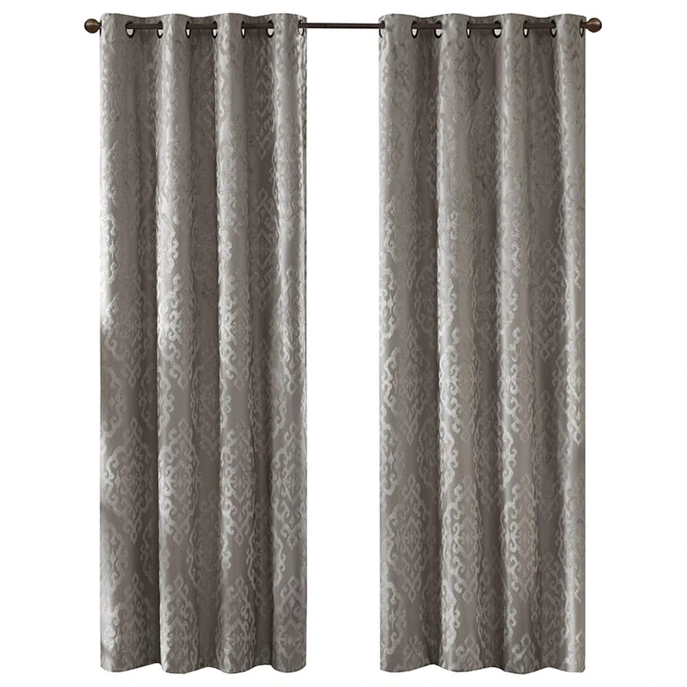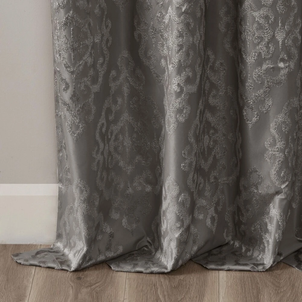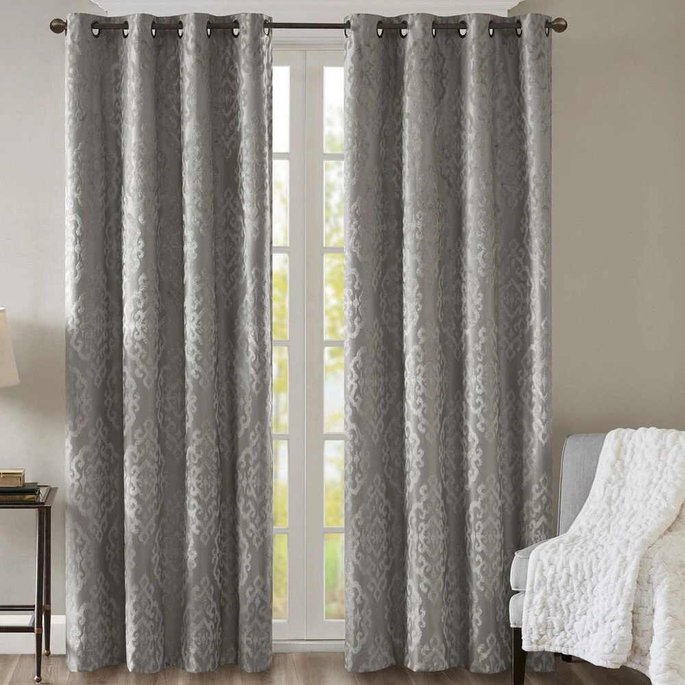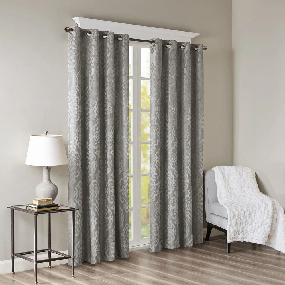 Give your home the lavish style and energy efficiency it deserves with our SunSmart Mirage Knitted Jacquard Total Blackout Panel. This elegant window panel flaunts a knitted jacquard damask design in a rich charcoal hue, creating a luxurious sheen and texture. The heavyweight fabric features a foam-back and bonding finish that blocks out all sunlight and provides a maximum protective barrier against noise intrusion. With 100% total blackout properties, this window panel offers a maximum level of privacy and energy savings, which makes it perfect for bedrooms, media rooms, or any private spaces. A gunmetal grommet top detail completes the look, while also making it easy to hang, open, and close the window panel throughout the day. Fits up to a 1.25 diameter rod. Lighting level: Pitch Black Ambiance.
