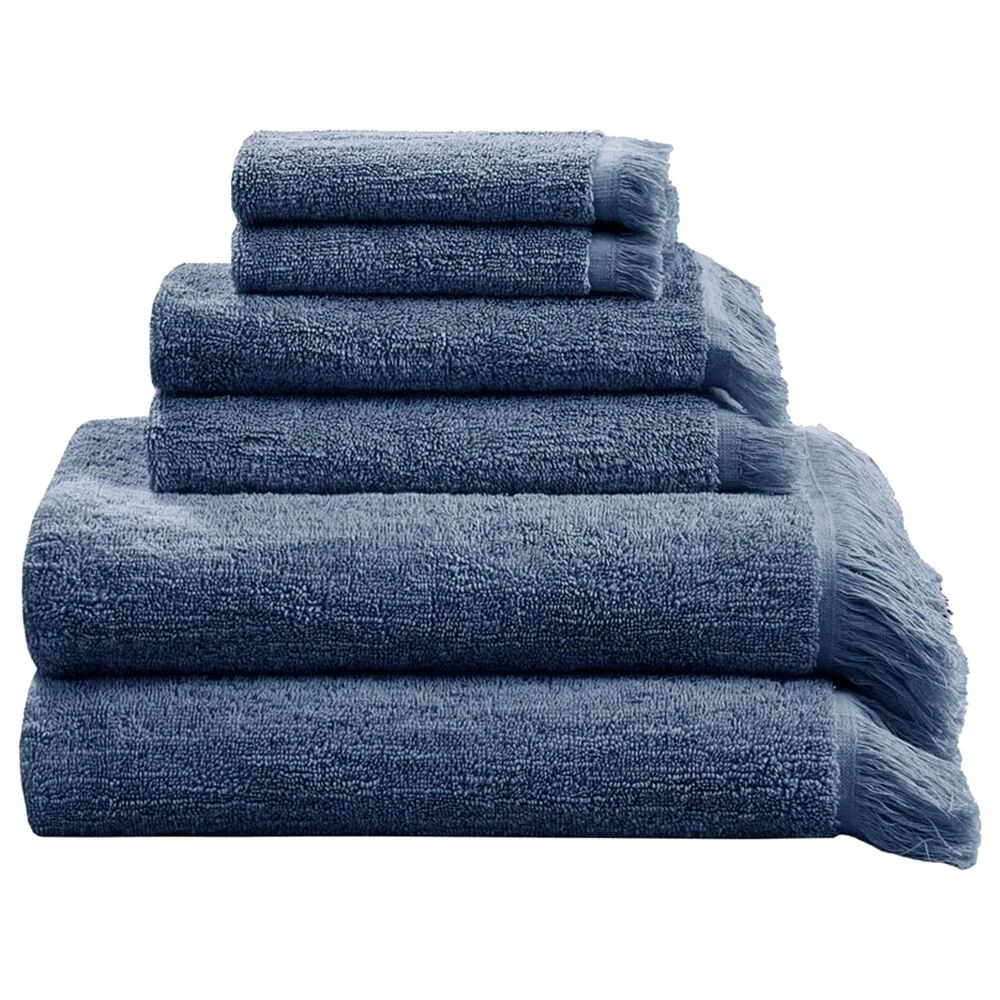 For a stylish and simply cozy update, the INK+IVY Nova Cotton Dobby Slub 6 Piece Towel Set is the perfect soft and comfy addition to any bathroom. Made from 100% terry cotton, this towel set features an ink dyed slub pattern that creates beautiful texture and dimension; while a self-fringe hem detailing, provides a unique craftsmanship touch for an artisan and global inspired design. With a 630gsm rich quality weight, this cotton towel set offers a super soft, plush feel that is also highly absorbent to keep you warm and dry. Machine washable for easy care; this 6 Piece Set includes: 2 Bath Towels (30×54), 2 Hand Towels (16×28), and 2 Wash Towels (13×13).