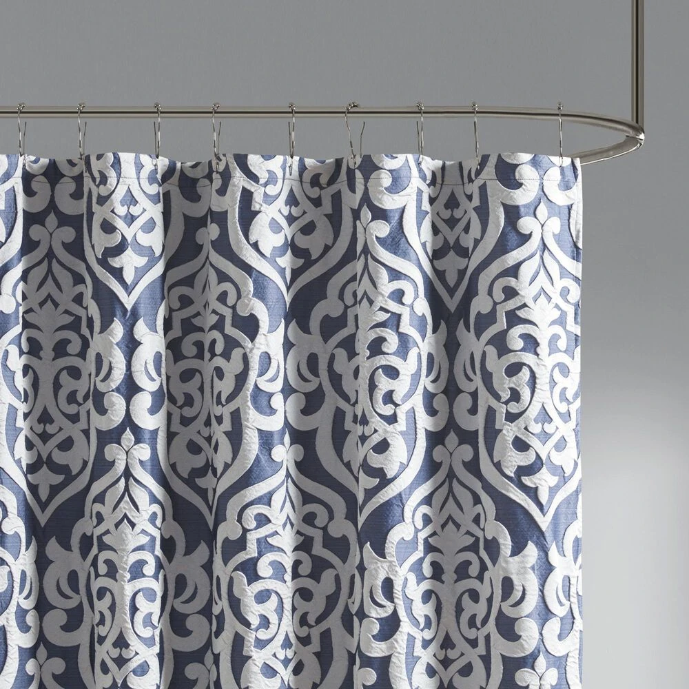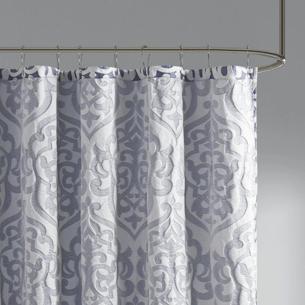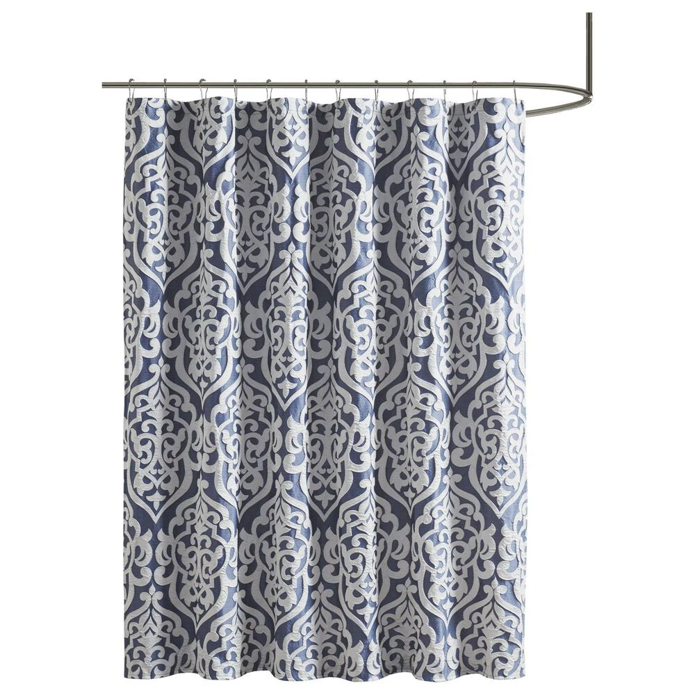Add a touch of class to your bathroom with our Madison Park Odette Jacquard Shower Curtain. This luxurious textured shower curtain flaunts a gorgeous silver damask medallion design on a stria navy jacquard ground that adds rich texture and dimension to the lavish look. Measuring 72×72″, each shower curtain is finished with 12 button holes on top making it easy to assemble hooks and hang onto rod (hooks and rod not included). To better preserve this beautiful shower curtain, a water repellant liner is highly recommended and can be purchased separately (liner not included).