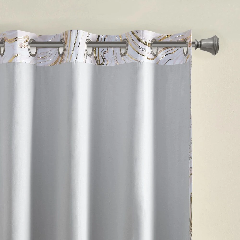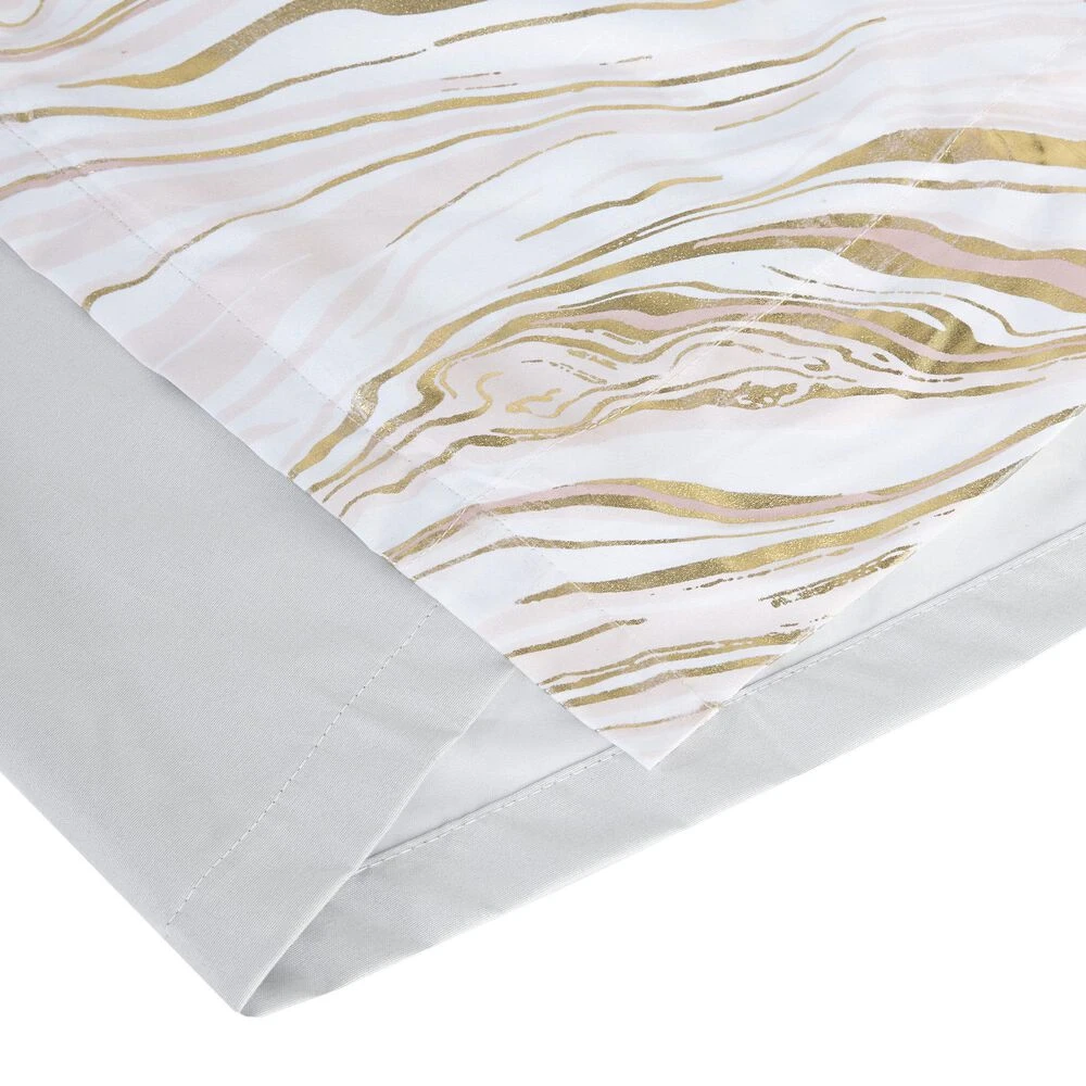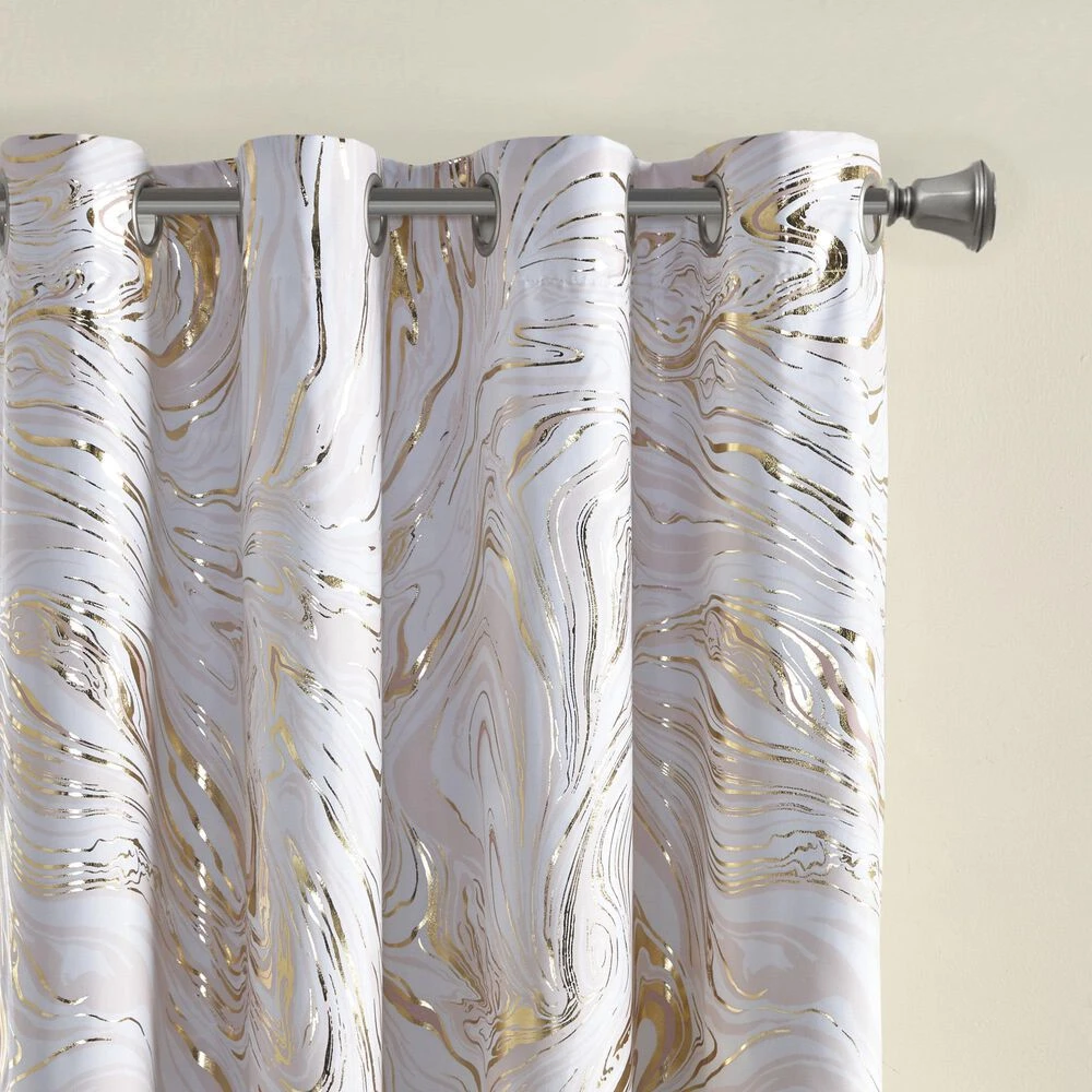 The Intelligent Design Rebecca Grommet Top Printed Marble Metallic Blackout Curtain adds a gorgeous and striking update to your bedroom decor. This window panel flaunts a gold marble metallic print on an ultra-soft blush microfiber base. Using thermal technology on the back of the curtain panel, a 3-Pass foamback liner blocks 100% exterior light and noise, while providing excellent energy efficiency and maximum privacy. This window panel is also OEKO-TEX certified, meaning it does not contain any harmful substances or chemicals, ensuring quality comfort and wellness. Easily hang this window panel using the silver grommet top that fits up to a 1.25 diameter rod. Machine washable for easy care, this 100% blackout panel adds a stunning modern touch to your bedroom and helps provide a restful nights sleep. 2 curtain panels must be purchase for each window for standard coverage.