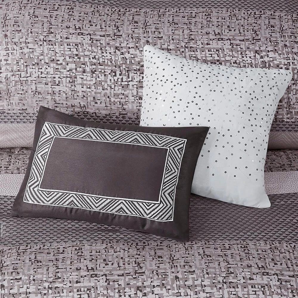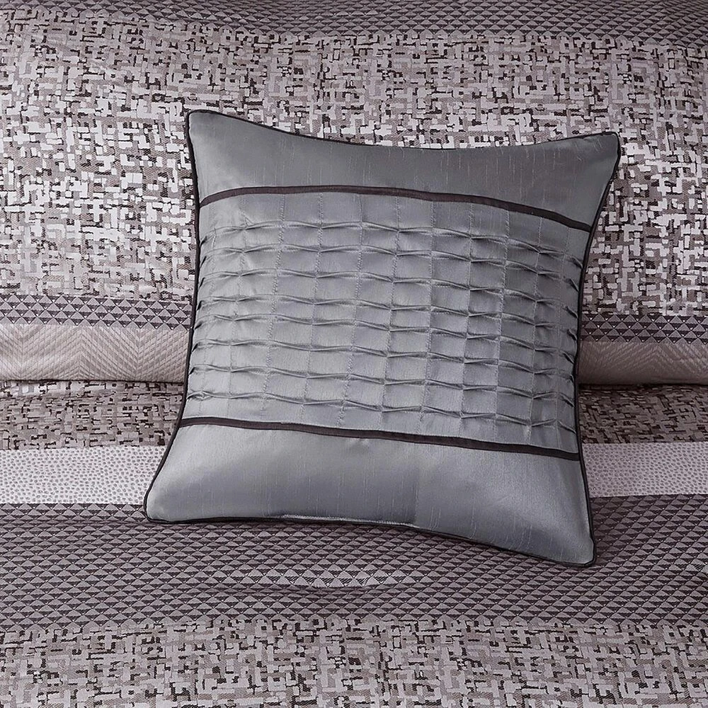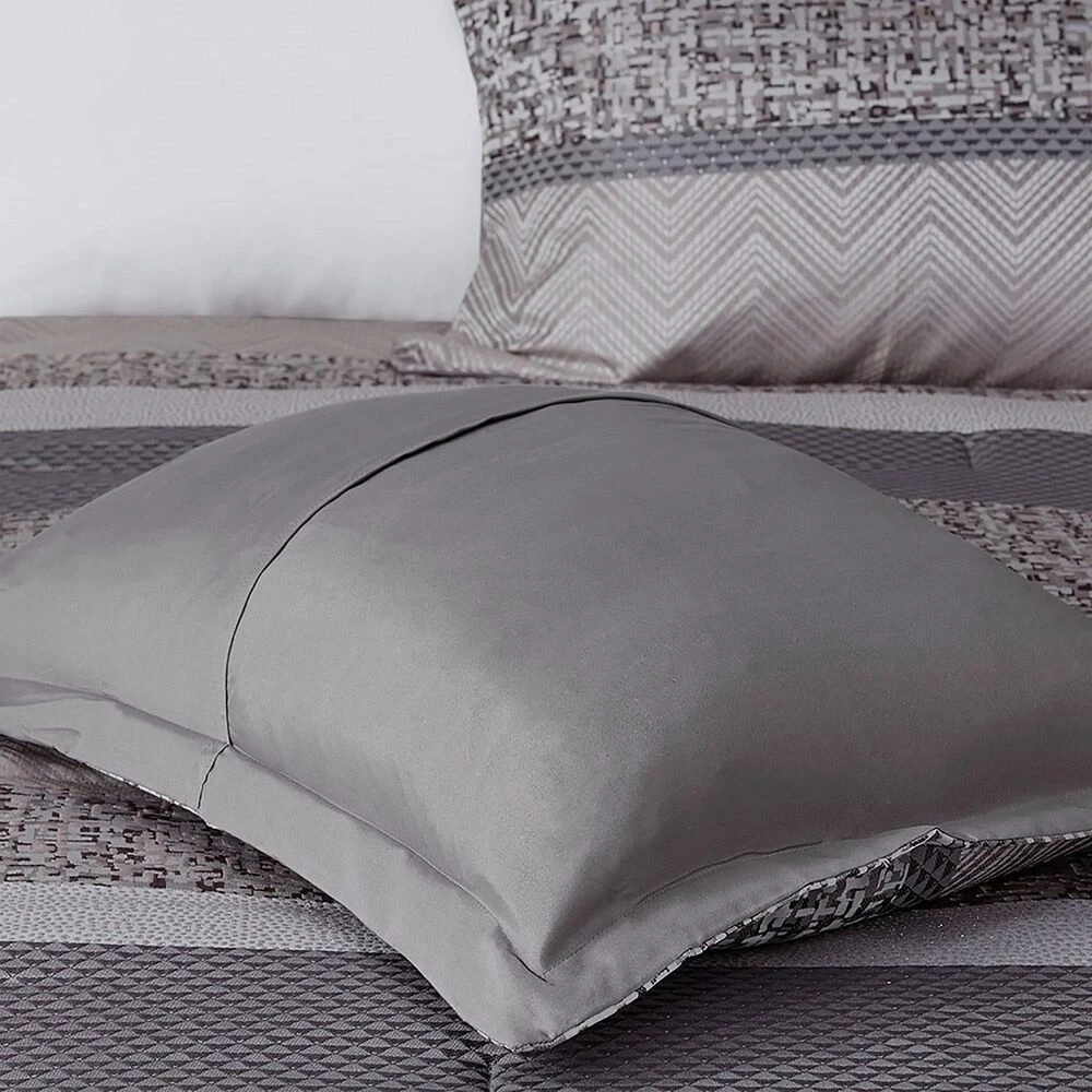 Give your bedroom a new luxurious look with the Madison Park Rhapsody 7 Piece Jacquard Comforter Set. This jacquard comforter features a grey and taupe stripe design of several different motifs on the face with a solid grey reverse, for a chic transitional look. The 2 matching shams complement the design of the comforter to complete this glam comforter set. Also included is a solid brown bed skirt and 3 decorative pillows with embroidery and pleated details provide the finishing touches. Machine washable for easy care, this jacquard comforter set brings a sophisticated update to your bedroom decor.