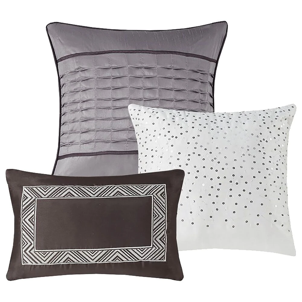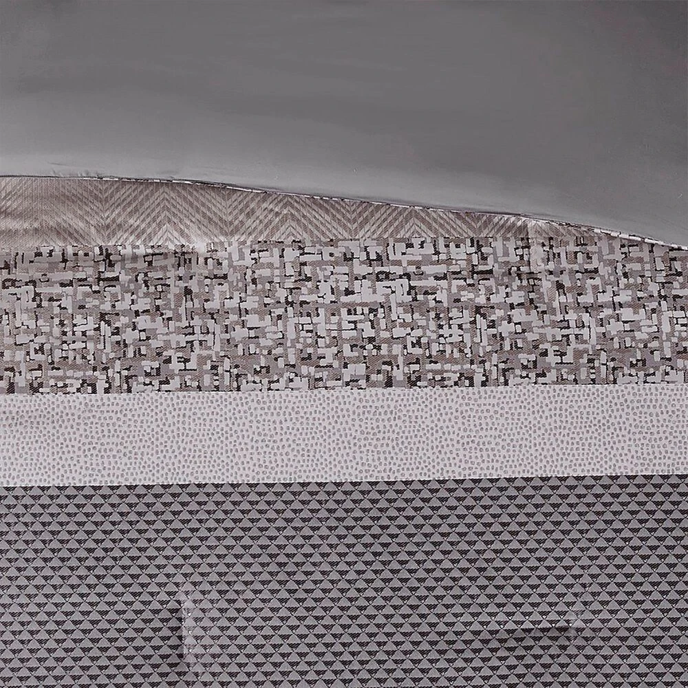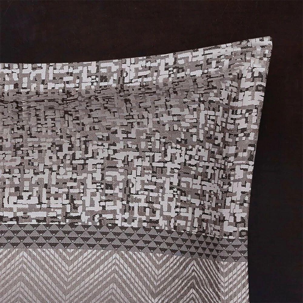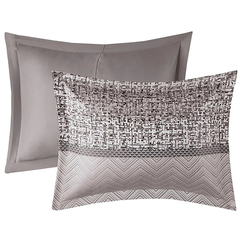 Give your bedroom a new luxurious look with the Madison Park Rhapsody 7 Piece Jacquard Comforter Set. This jacquard comforter features a grey and taupe stripe design of several different motifs on the face with a solid grey reverse, for a chic transitional look. The 2 matching shams complement the design of the comforter to complete this glam comforter set. Also included is a solid brown bed skirt and 3 decorative pillows with embroidery and pleated details provide the finishing touches. Machine washable for easy care, this jacquard comforter set brings a sophisticated update to your bedroom decor.