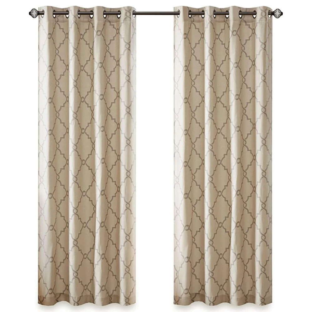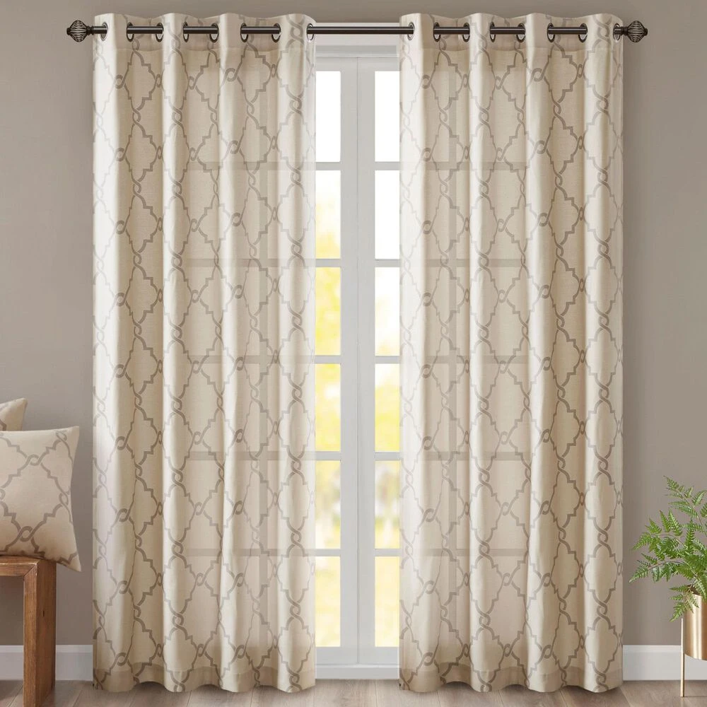 The Madison Park Saratoga Fret Print Panel is the perfect addition for a casual and stylish update to your home decor. This window panel features a trendy soft grey fretwork on a light beige ground, creating a simple yet modern look. The cotton blend basket weave fabric softly filters the perfect amount of sunlight into your home, while providing texture for natural appeal. Silver grommet top detail makes this panel easy to hang, open, and close throughout the day. Fits up to a 1.25″ diameter rod. Pattern position may vary per panel due to random cutting of fabric.
