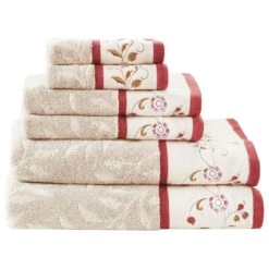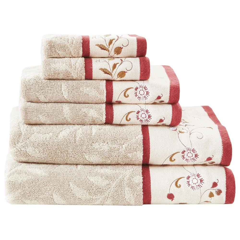 Add a touch of elegance to your bathroom decor with our Madison Park Serene Embroidered Cotton Jacquard 6 Piece Towel Set. These cotton towels feature a jacquard leaf pattern with a floral embroidered hem, and red contrast piping details to create a beautiful and sophisticated look. This cotton towel set is also OEKO-TEX certified, meaning it does not contain any harmful substances or chemicals, ensuring quality comfort and wellness. Highly absorbent and incredibly soft from its medium weight terry loop construction, this towel set is also machine washable for easy care for the perfect addition to any bathroom. Set includes: 2 standard 27×52″ bath towels, 2 standard 16×28″ hand towels, and 2 standard 12×18″ fingertip towels.