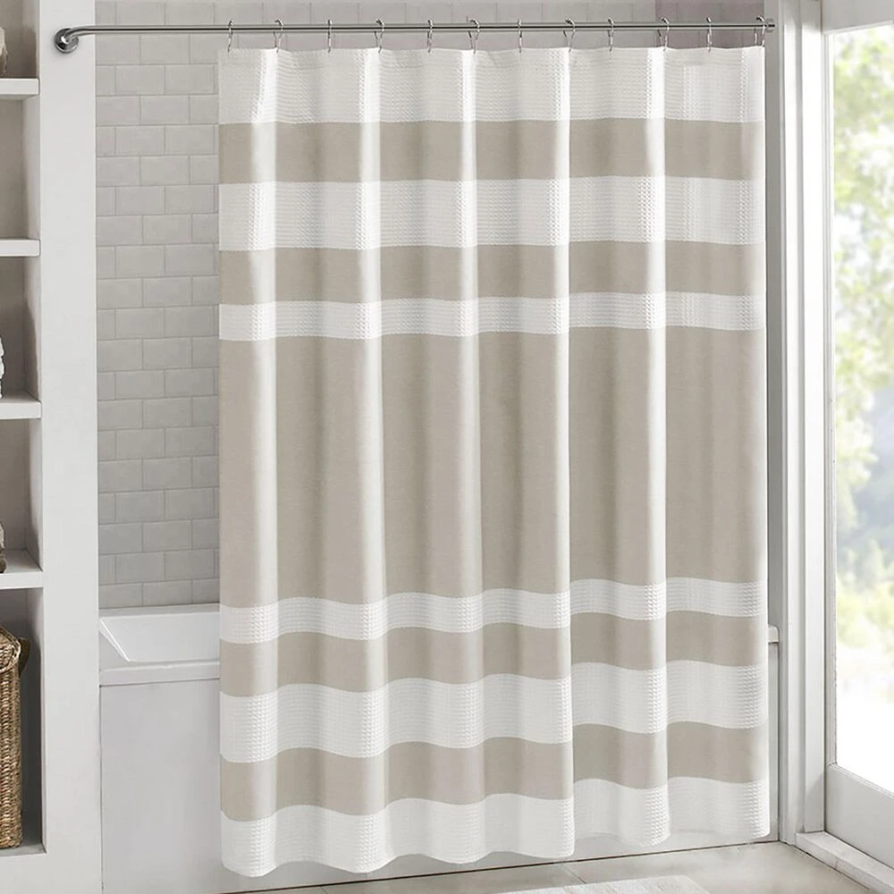 Update your space with the Madison Park Spa Waffle Shower Curtain with 3M Treatment. Featuring a fresh and updated stripe design, this shower curtain is made of a light heathered colored fabric pieced with a white waffle weave base creating a beautiful texture for the perfect spa touch to your decor. A temporary 3M Scotchgard water repellent treatment keeps your curtain looking newer, longer and is active for multiple washes. A waterproof liner is not included but still highly recommended to keep this shower curtain in its best condition; Hooks and Rod also not included and should be purchased separately. Various colors and sizes are available to fit any bathroom space. Size shown in image is standard 72×72″, stripe design may vary per all other sizes.
