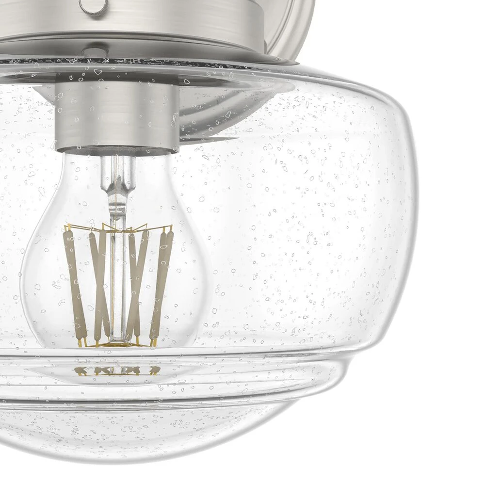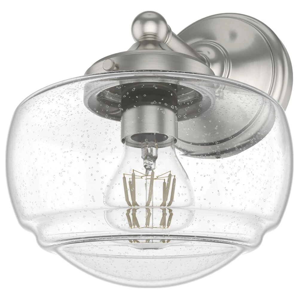 The Saddle Creek wall sconce combines traditional schoolhouse style with elevated elements to create a fresh spin on a classic design. Inspired by the iconic American schoolhouse light, the Saddle Creek illustrates the contemporary design principle of better, not more. The detailed glass shade complements the casual simplicity of the sconces metal fittings and finish. Mix and match with other fixtures from this collection or from our ceiling fan designs.