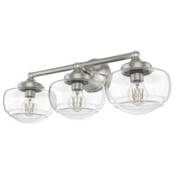 Introduce a vintage element to your vanity with the Saddle Creek fixture, inspired by the iconic American schoolhouse light. This vanity lighting will reflect a warm glow that illuminates subtle detailing within the glass. The Saddle Creeks simple metal finish and fittings lend a subtlety to the lights sophisticated style. Mix and match with other fixtures from this collection or from our ceiling fan designs.