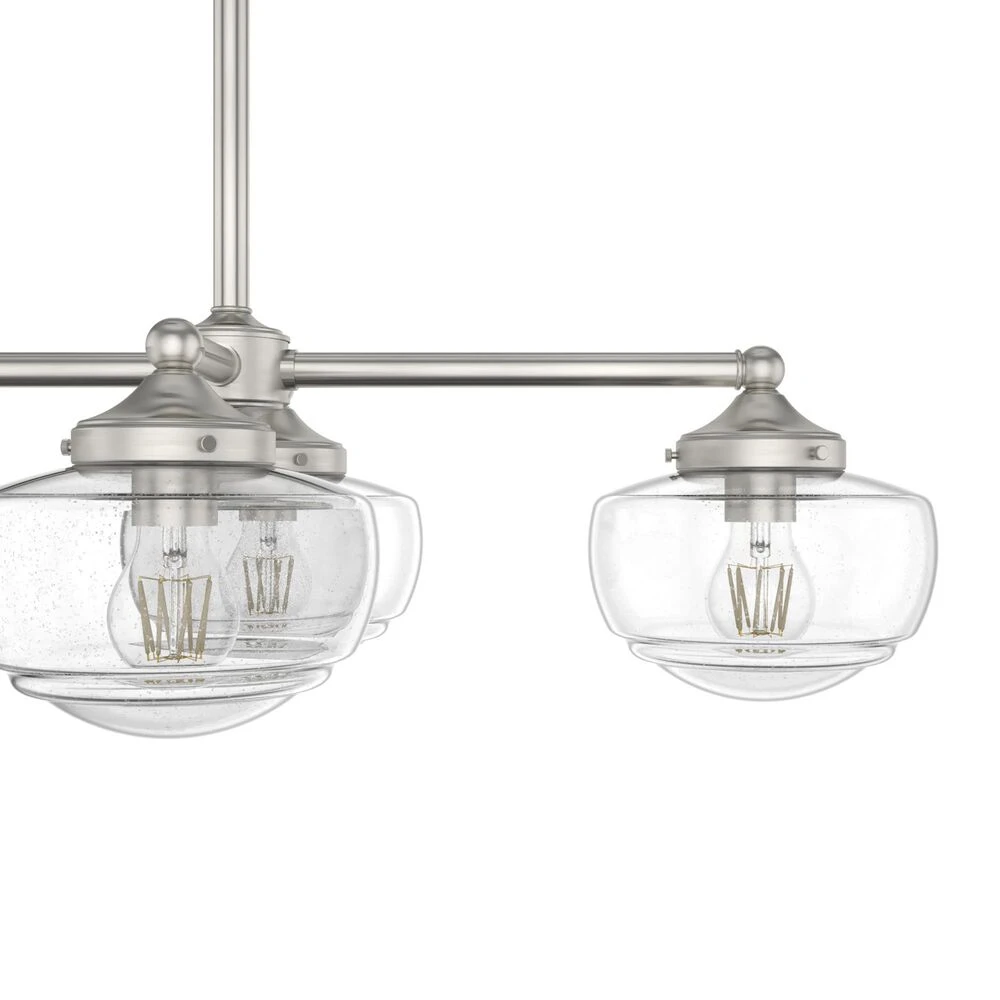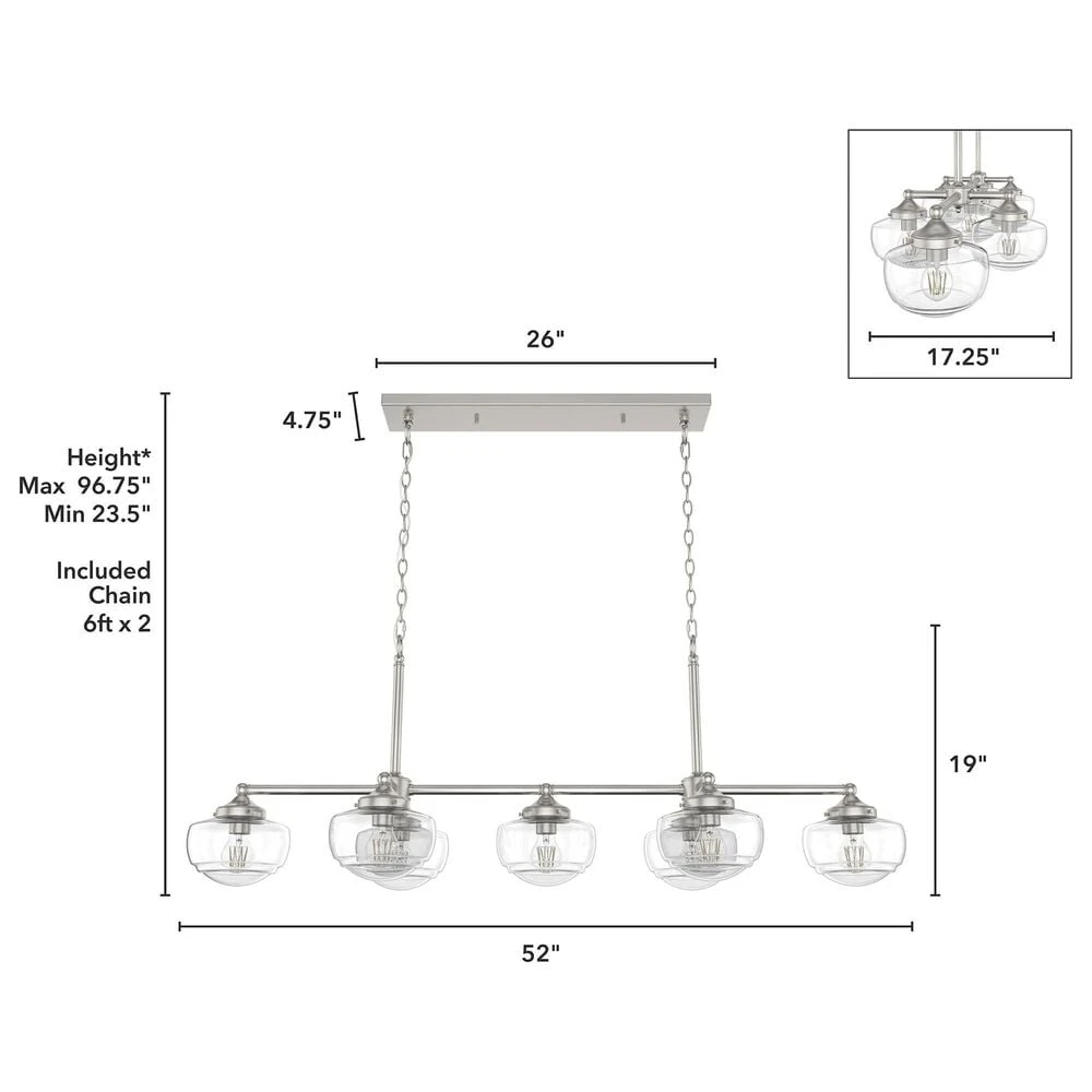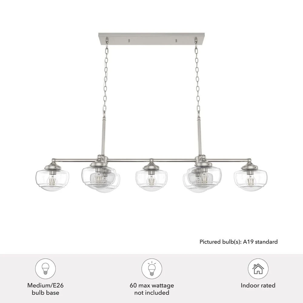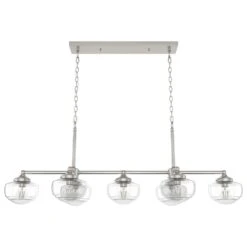 With its modern take on schoolhouse style, the Saddle Creek linear chandelier might be the perfect fixture for your homes dining room or kitchen. Artfully arranged glass globes offset the chandeliers simple metal finish, creating a piece elegant enough to accent a formal dining room yet casual enough for a kitchen island. The Saddle Creek offers a fresh look at a classic design.