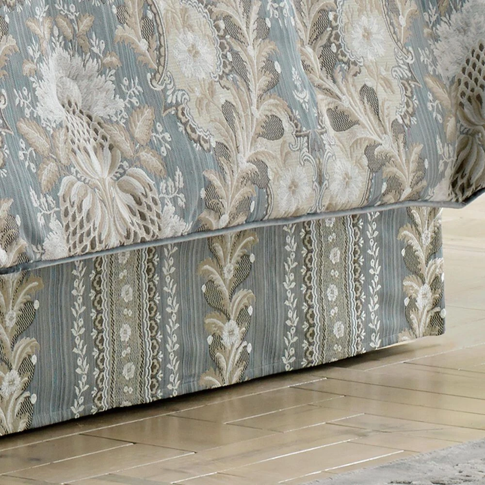 French Blue is a delicate and highly detailed woven jacquard. The design features sophisticated yet elegant blue and taupe bouquets framed with leaves and blossoms in the same shade. The oversized comforter is embellished with blue velvet piping. The 4 pcs set includes: One beautifully designed comforter. Two perfectly matched padded pillow shams with a hidden zipper. Pillow shams are engineered, centering the woven jacquard floral and finished with blue velvet piping. The bedskirt is a woven fabric in solid cream and finished by a coordinating woven stripe on the border. The bedskirt contains split corners and a 15 drop.