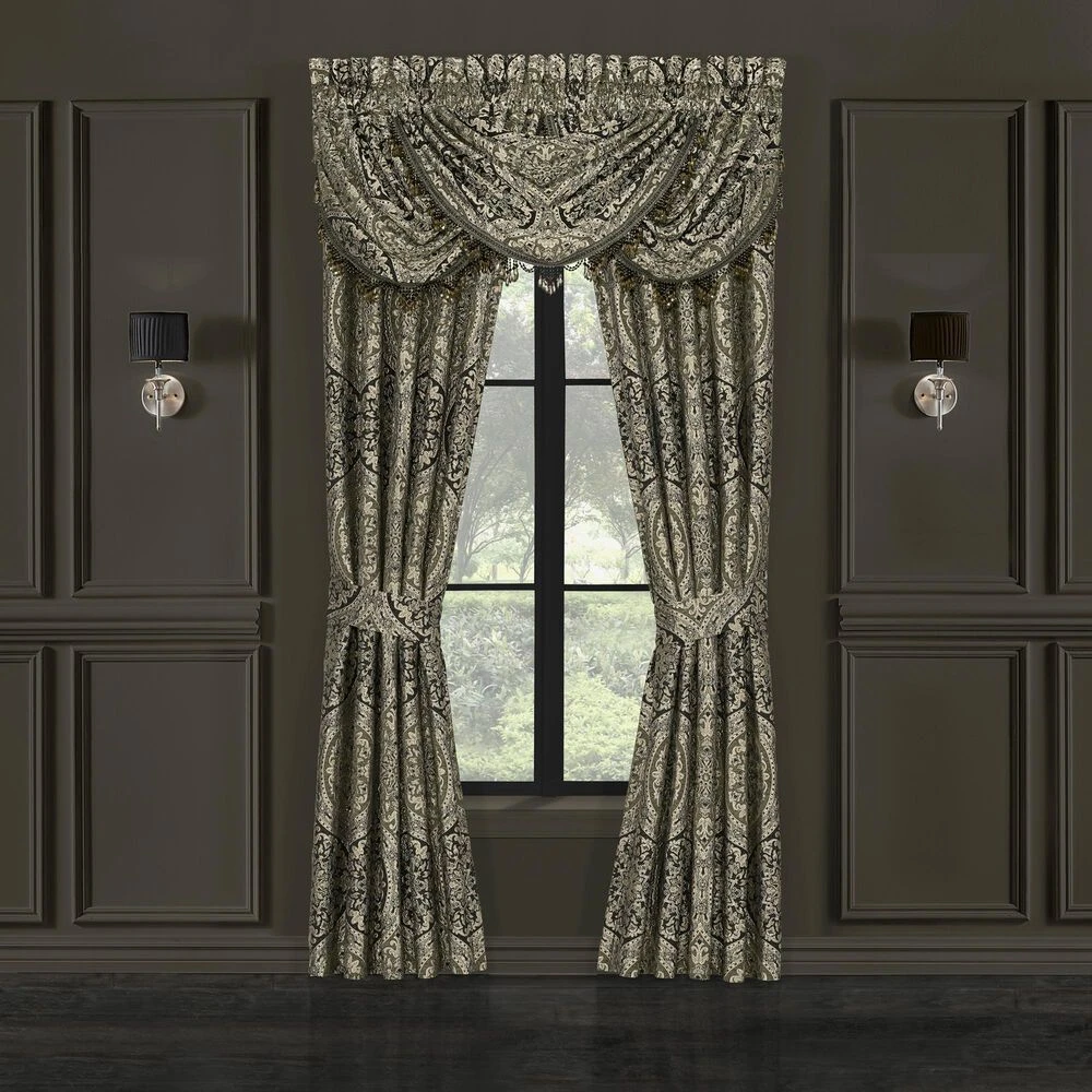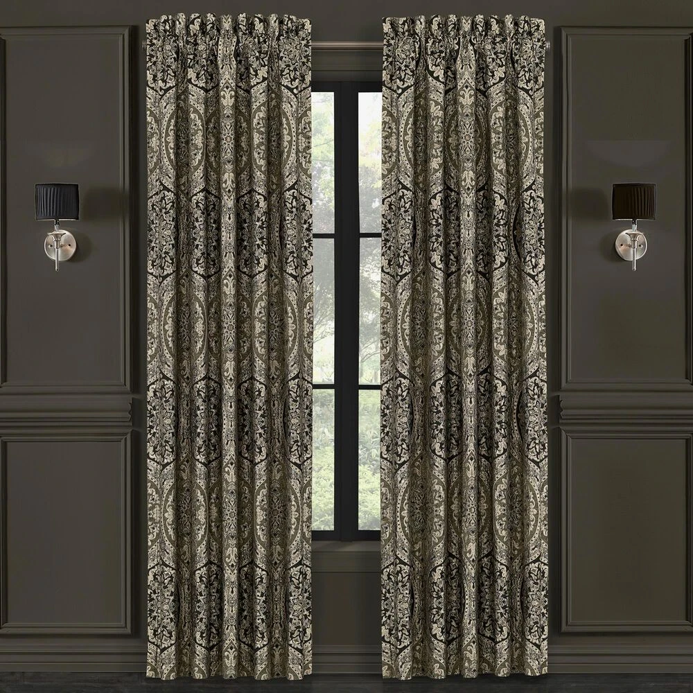 The Window Panel Pair is exquisite with its fine details and sophisticated use of black and olive green colors. This beautifully woven jacquard medallion fabric is truly timeless and rich with its soft chenille finish. These lined panels include tiebacks to create an open look, and they provide ample room darkening shade, keeping you comfortable throughout the day. The 3″ header and 3″ rod pocket make these panels easy to hang.