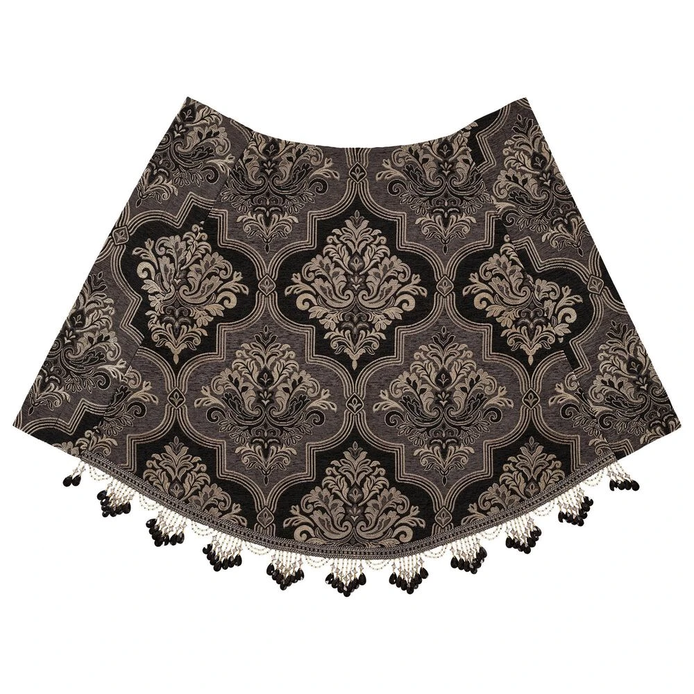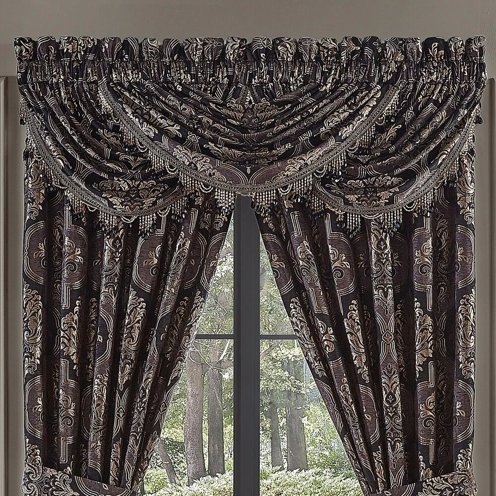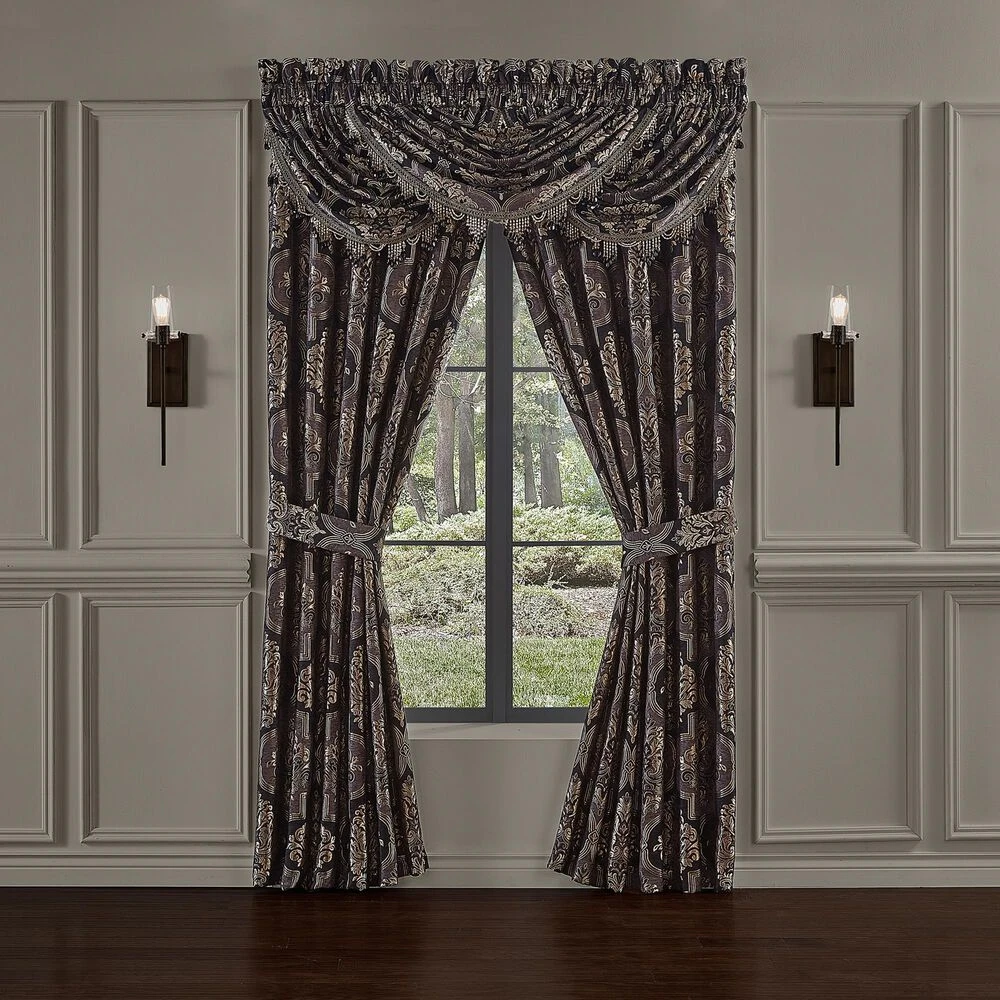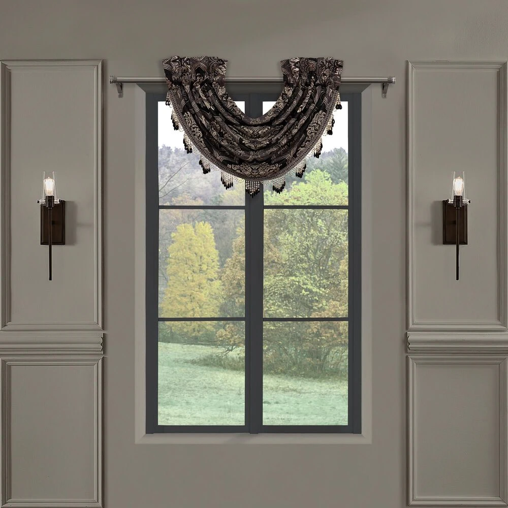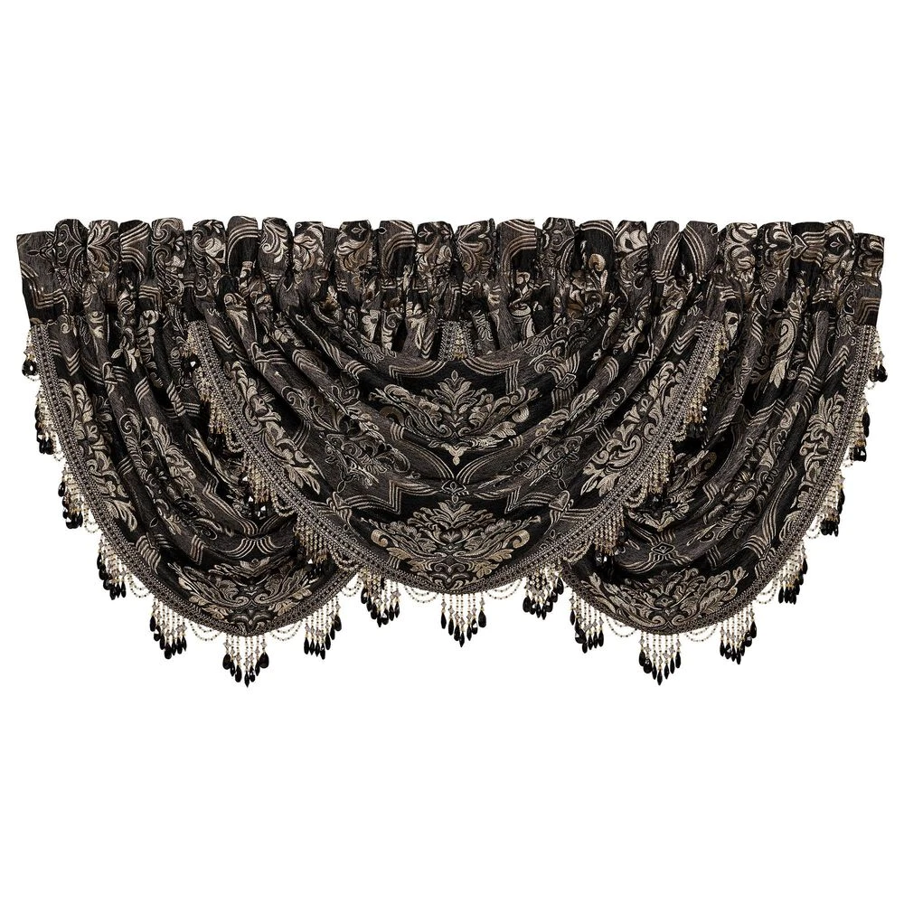 The Window Valance is exquisite with its fine details. Featuring a framed woven damask in two tones of chenille black and graphite. A crystal tassel fringe accenting the edge of the valance adds a tasteful touch of luxury. The 3″ header and 3″ rod pocket make the valance easy to hang.