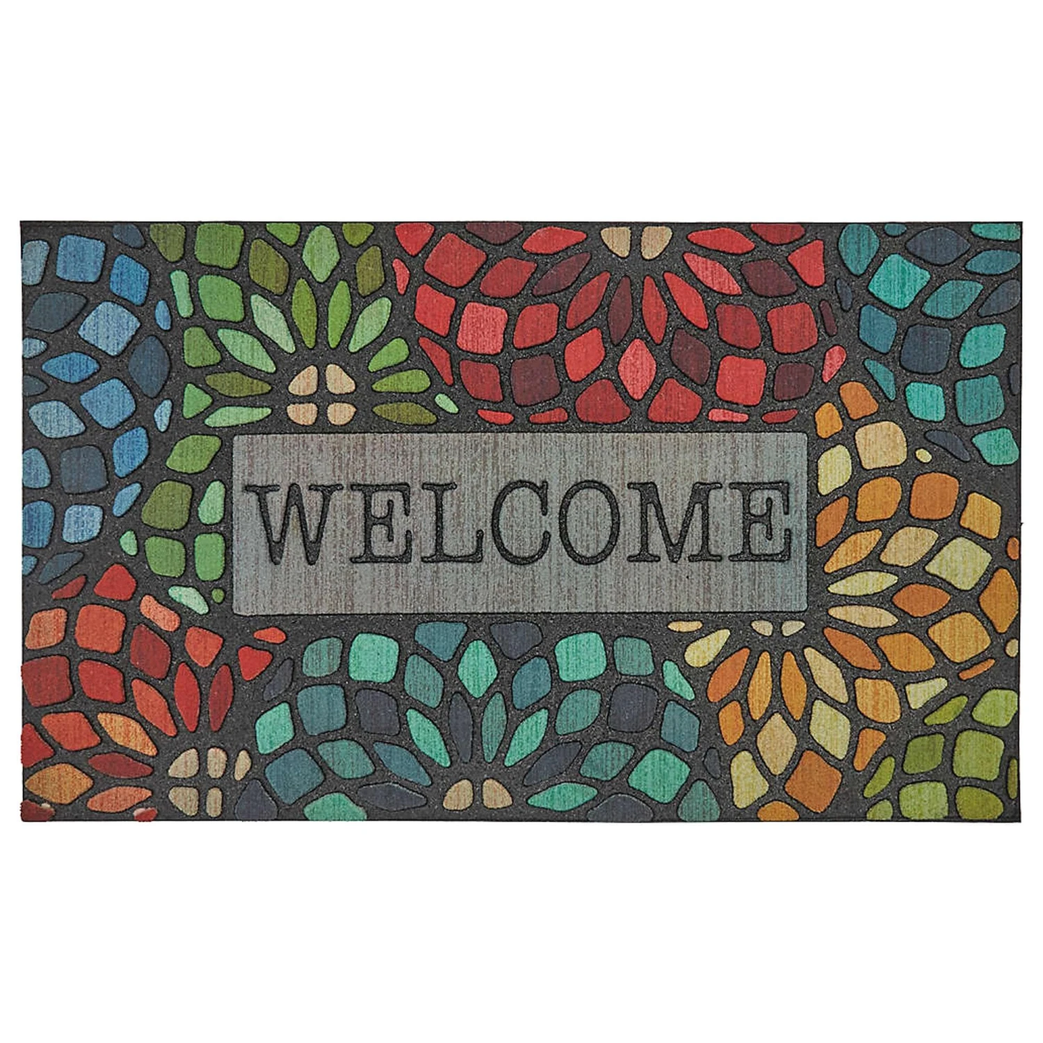 Opulently overdyed blue, green, pink, red, gold, orange and teal mosaic medallions add elegance to any entryway with Mohawk Homes Stained Glass Floret Welcome Doormat. Environmentally friendly, this doormat from Mohawk Homes Doorscapes Collection is backed with the dependable durability of 1 percent recycled rubber. Annually Mohawk Home recycles over 3 million pounds of rubber tires, one of the largest and most hazardous types of post-consumer waste; and gives them new life as designer doormats. The recycled rubber doormats of this collection have a high definition decorative top surface design constructed of a 1 percent polyester flock. This top surface absorbs moisture and is ideal for scraping dirt from shoes before its tracked indoors, helping to keep your indoors beautiful too.
