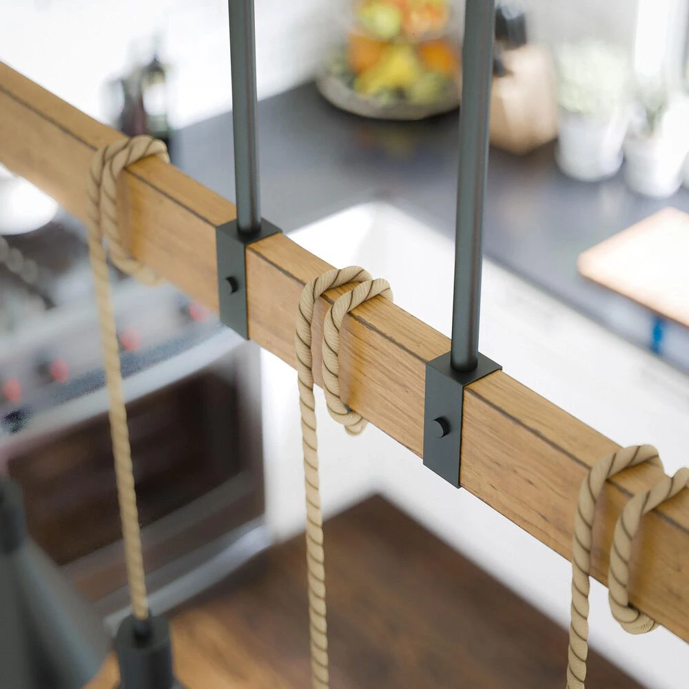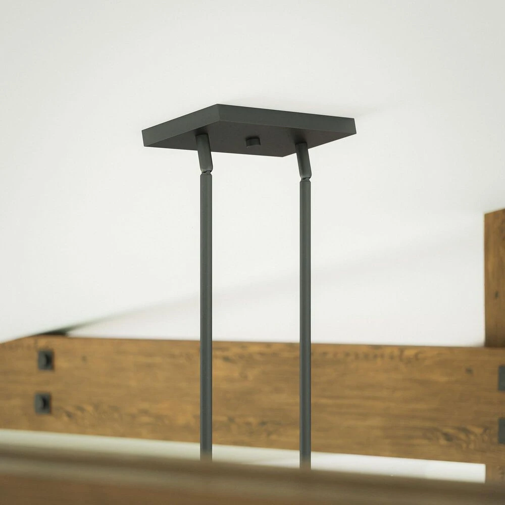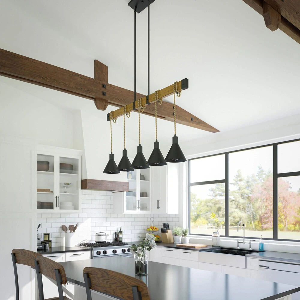 With a sleek stripped down, raw industrial look, this 5 light kitchen island fixture fills your meal prep space with plenty of downward directional task lighting and effortless, urban style. Matte black finished shades are suspended by rope cords wrapped around a faux wood beam – perfect for blending rustic farmhouse style with raw industrial design.