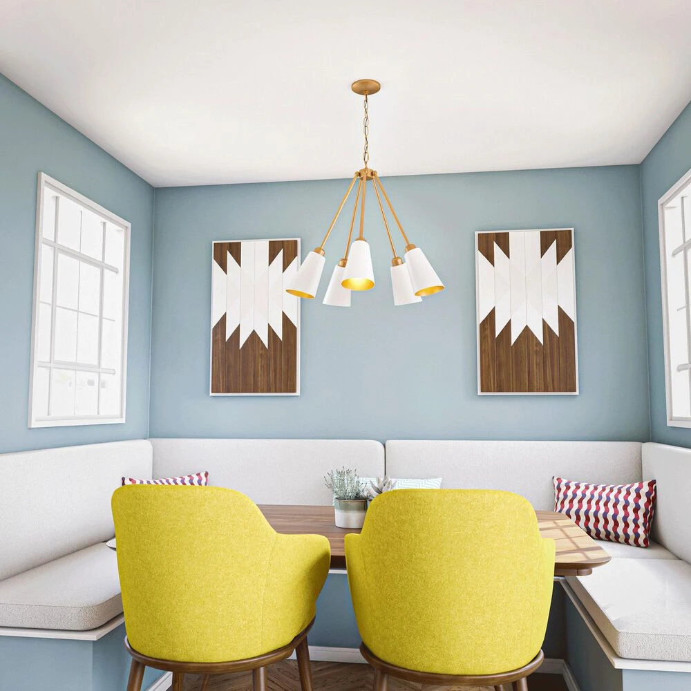 A tale of two finishes with a matte white and glimmering gold, this 5 light chandelier combines the clean-lined aesthetic of Art Deco design with a modern light and airy look perfect for your Mid-Century modern home. Install this stunning accent in your foyer to greet guests with the warm cascade of light, made brighter by the metallic gold lined slant cut shades. Hang in your vaulted ceiling dining room for a modern accent that complements your metallic table settings and luxe home decor. This posh chandelier will provide plenty of luxe style and bright lighting to your modern living spaces.