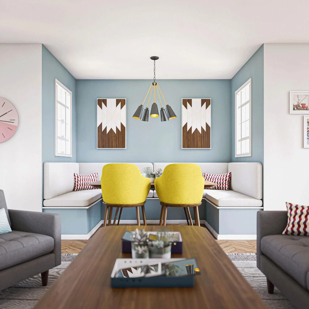 - Mid-Century Modern 5 light chandelier with slant cut shades and a stylish two-toned finish