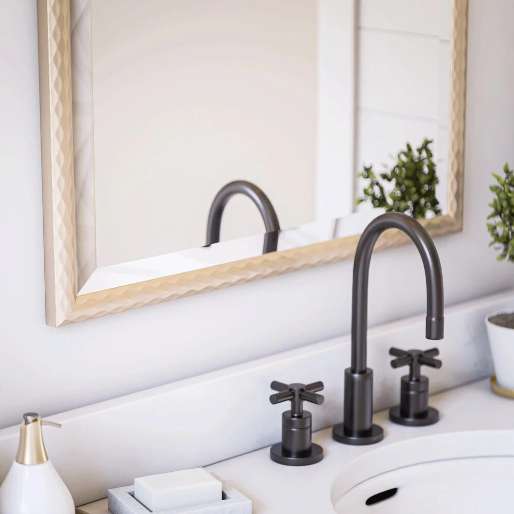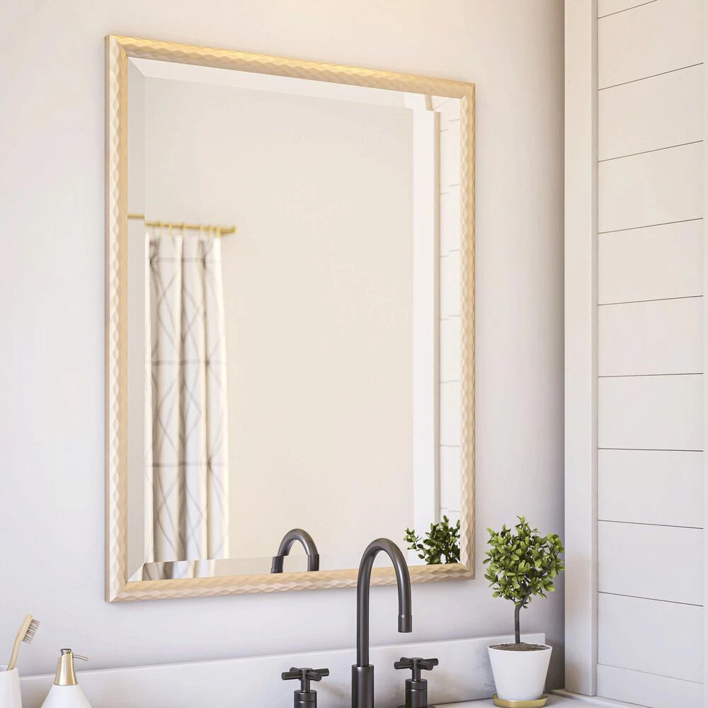 The perfect blend between classic and contemporary, this retro-inspired geometric wall mirror has a luxurious, golden finish that glimmers with the delicately subtle diamond pattern that lines the frame. This beveled wall mirror helps amplify the natural lighting in your guest bathroom or entryway, while the large, quality silver-backed mirror surface accurately reflects your profile, allowing you to easily adjust your hair and makeup. This shimmering accent is lightweight and easy to hang horizontally or vertically to suite your needs – above your entryway table, pedestal sink, dresser, fireplace, or master bathroom vanity.