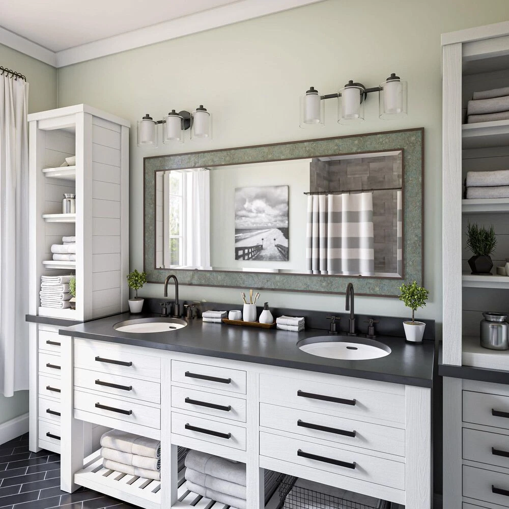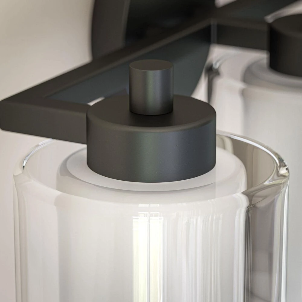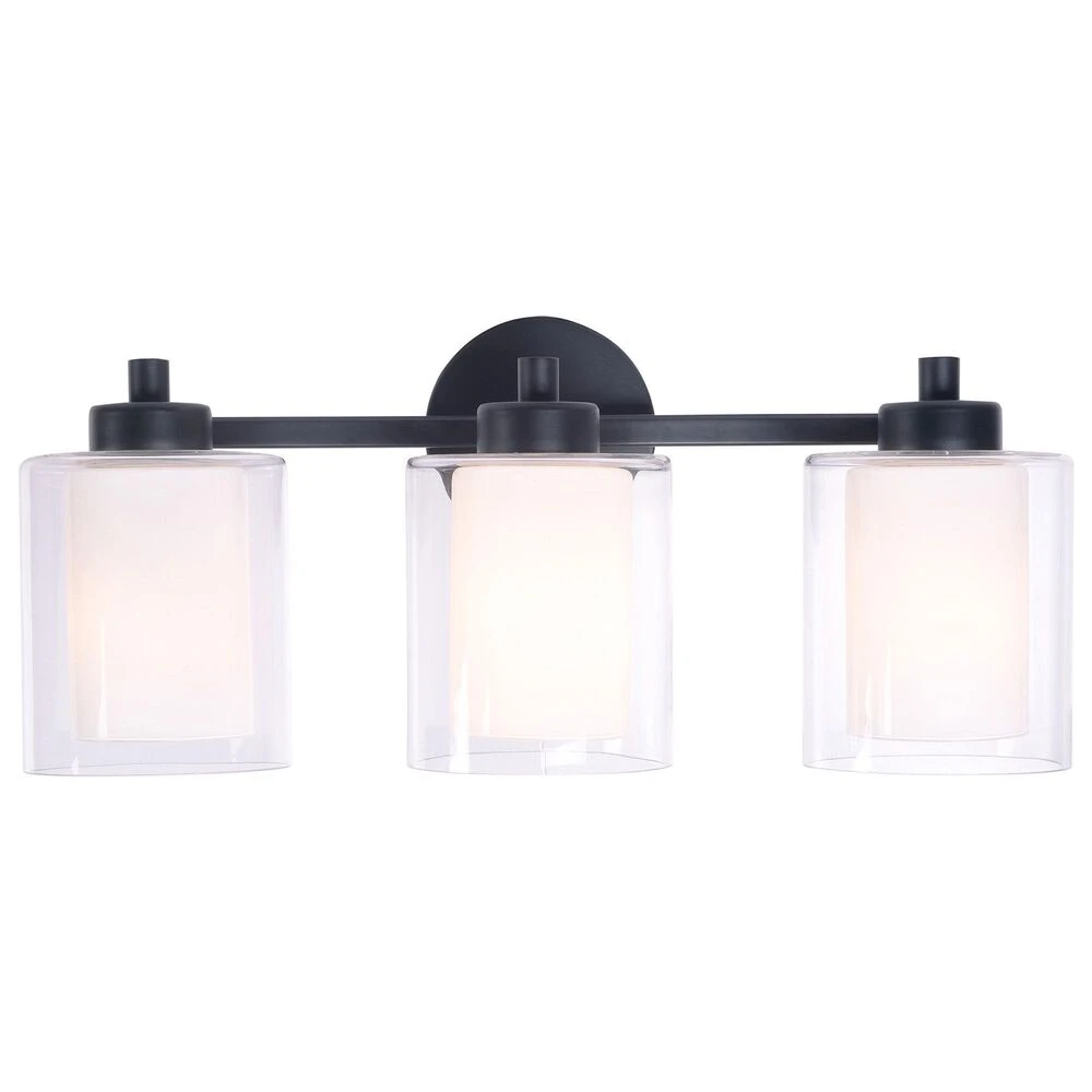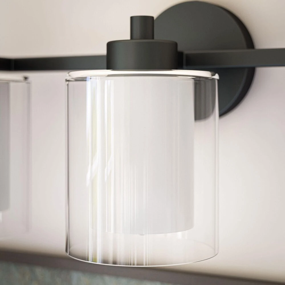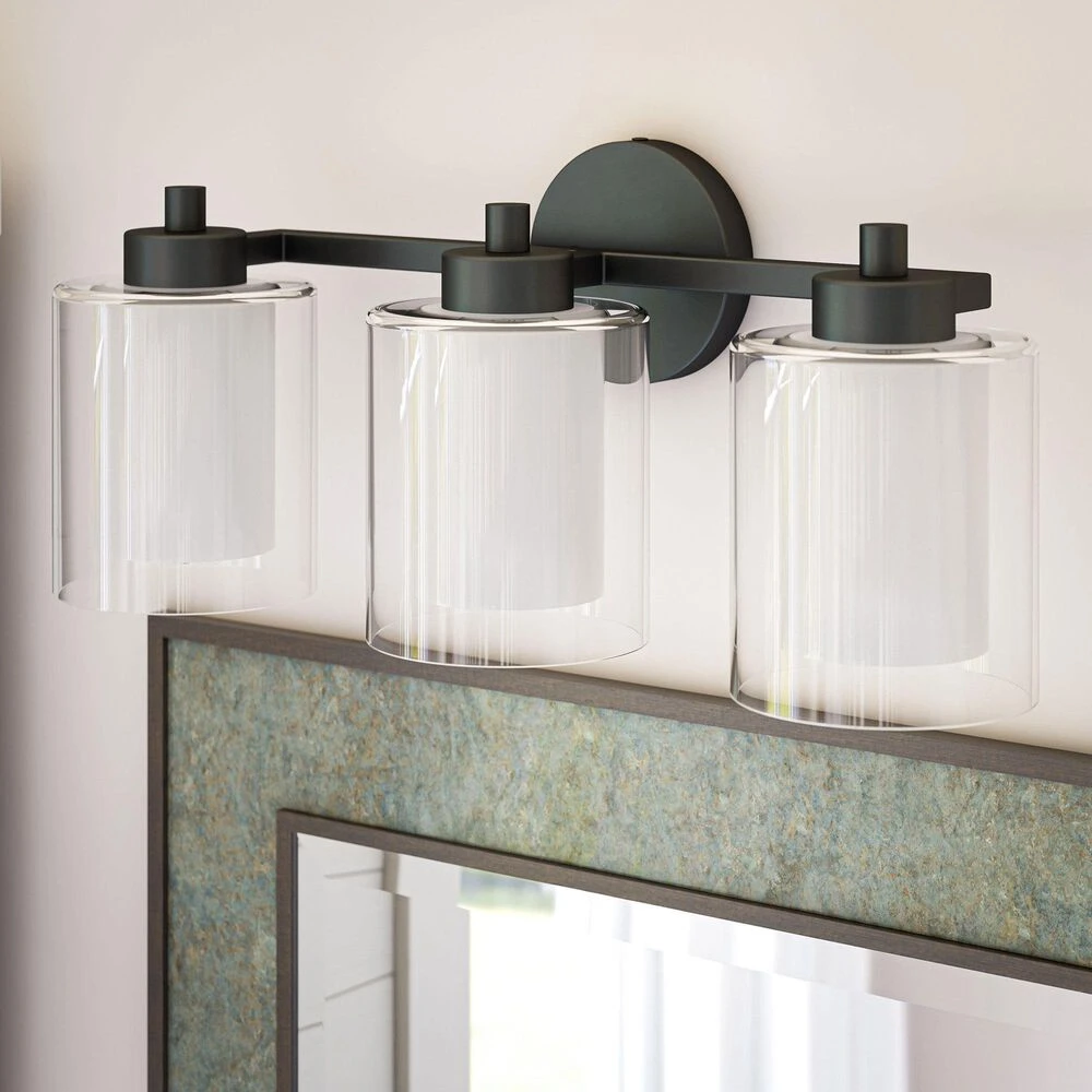 Sleek and stylish with a matte black finish, this stunning 3 light vanity adds a spa-like look to your relaxing master bathroom. This vanity sheds plenty of bright task lighting over your bathroom counters, making it easy to jump out of bed in the morning and kickstart your routine. A unique dual-shade construction features a frosted inner glass shade for brightly diffused light and a clear glass outer shade for sophisticated style – perfect for contemporary, modern, or casual guest or master baths.