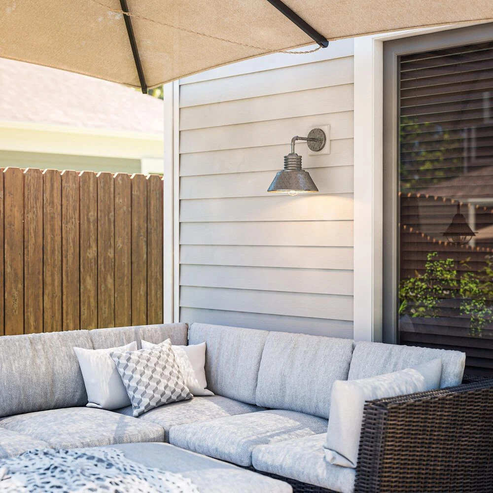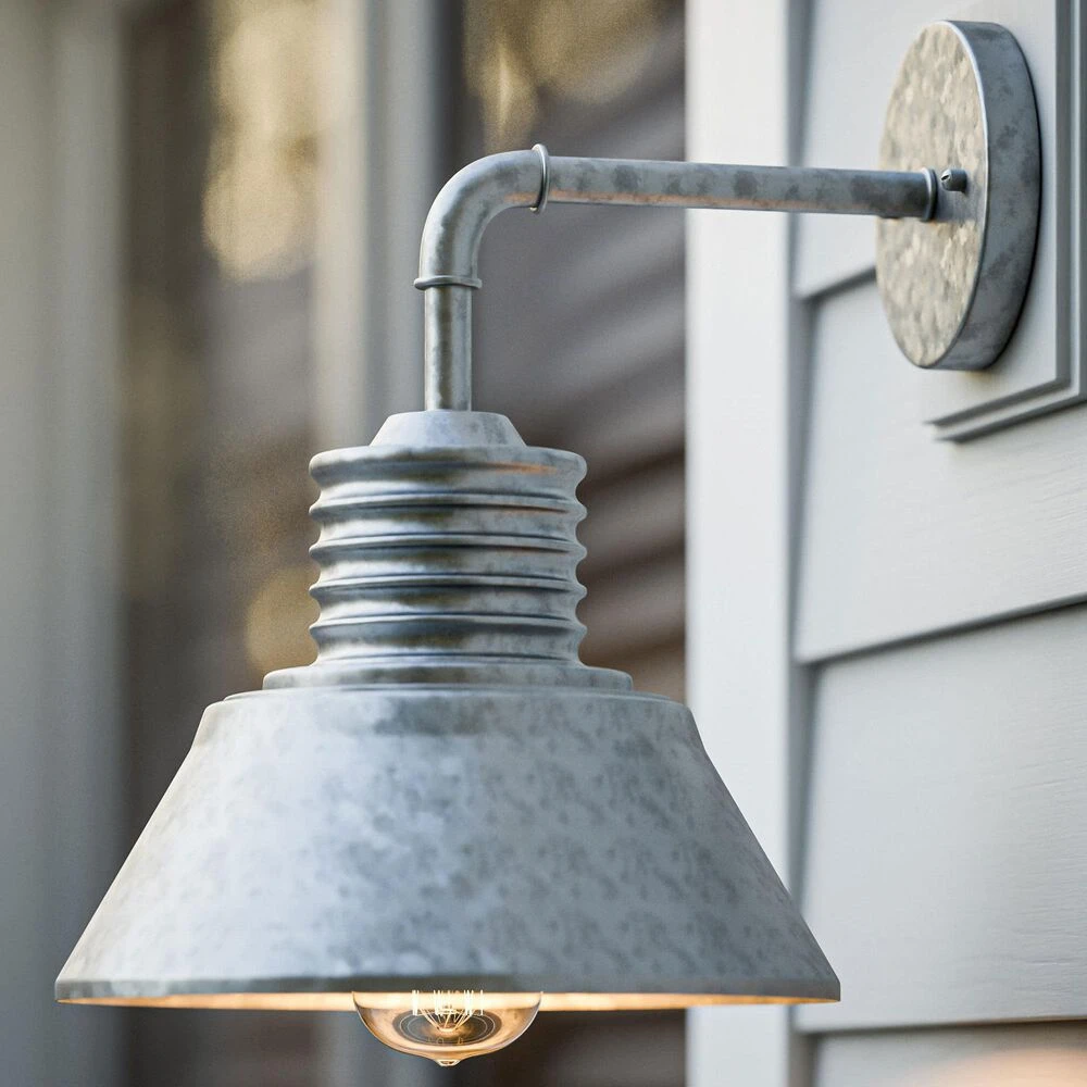 Rough and rustic textures of powdercoated steel and a shiny, galvanized finish complement the farmhouse aesthetic of this outdoor wall sconce. A wide barn-style shade is suspended from a long, pipe-like arm, casting a large glow on your pathways, doorways, and more. Part industrial, part country, this all-weather wall sconce is perfect for use indoors and out.