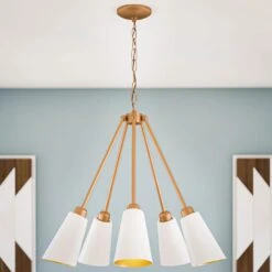 This Mid-Century Modern chandelier balances clean lines and geometric shapes to create an eye-catching centerpiece above your dining room table. Round frosted white glass shades contrast against the brilliant gold finish and straight lines of the sputnik-inspired design. This fixture includes 5 LED bulbs to cast a bright glow in your dining room, entryway, or living room, perfectly complementing your carefully curated mix of urban contemporary Mid Century home decor.