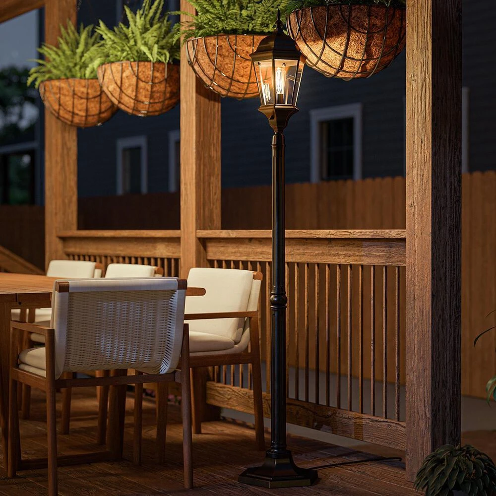 Designed like a scaled-down quintessential vintage light post from a quaint European village, this portable lantern can be relocated to wherever you need a bright glow outdoor walkways, gardens, even indoors. Detailed scrolled flourishes and an Art Deco-inspired flared base give this classic lantern an elegant, stately profile that complements the almost-black finish. Crystal clear glass panels allow the light to flow freely while protecting the bulb and other electrical components from moisture and inclement weather. The glass panels, waterproof switches, and quality finish ensures that your miniature streetlight withstands the elements, delivering classy style season after season. To ramp up the vintage charm, use a compatible Edison bulb.