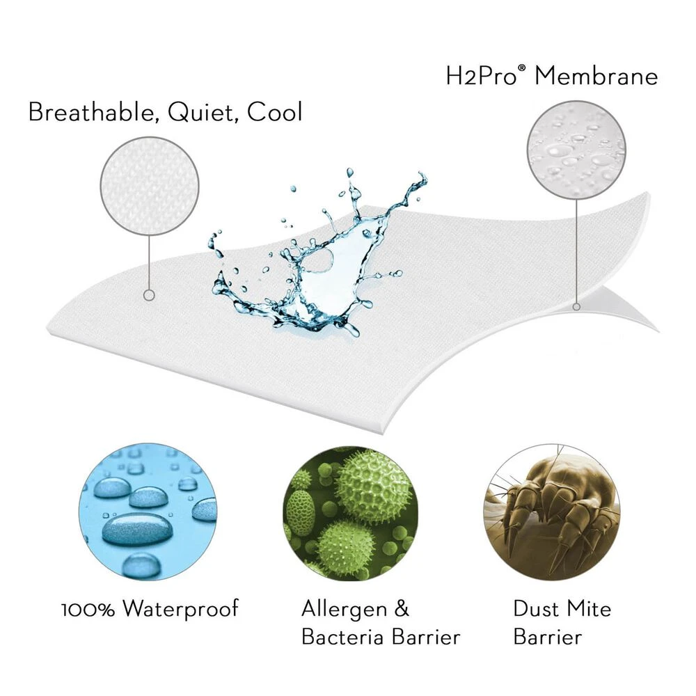 The Five 5ided® Smooth mattress protector helps prevent the development of asthma and features the laboratory-certified H2Pro® liquid-proof membrane on five sides of the mattress. With microscopic pores to allow air passage, the H2Pro® layer completely blocks liquids, viruses, dust mites and allergens. Unlike other bed protectors that sound like a plastic bag and don’t cover the whole mattress, the Five 5ided® protector is quiet and includes the universal fit elastic ensuring a secure fit for mattress depths 6-22.