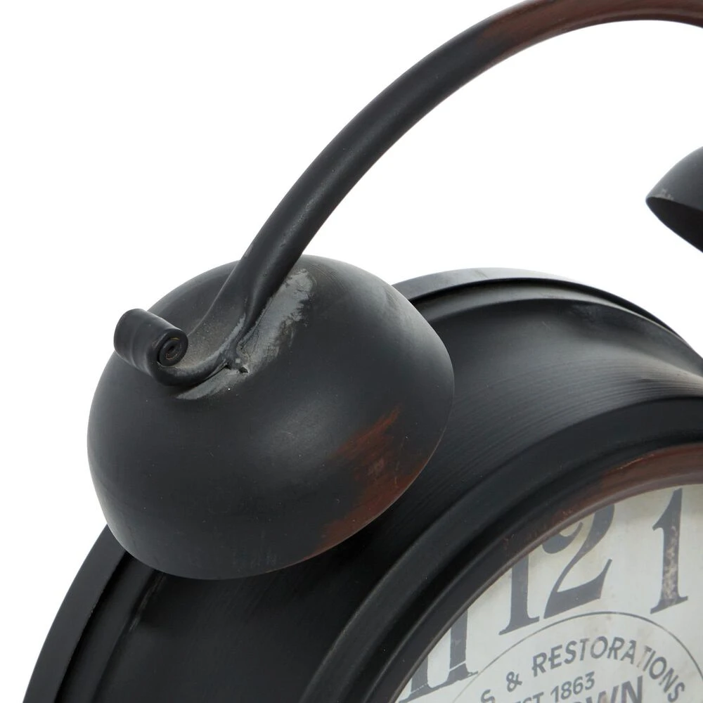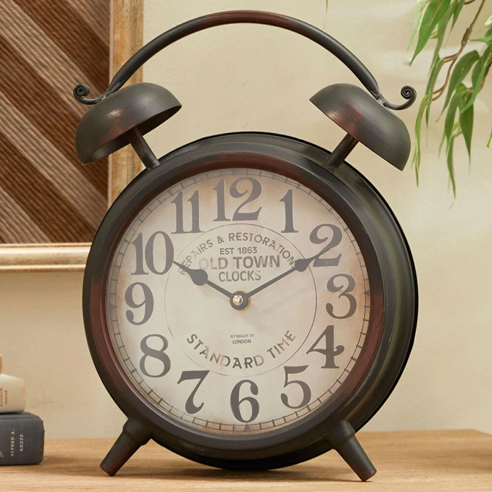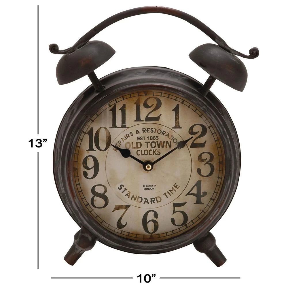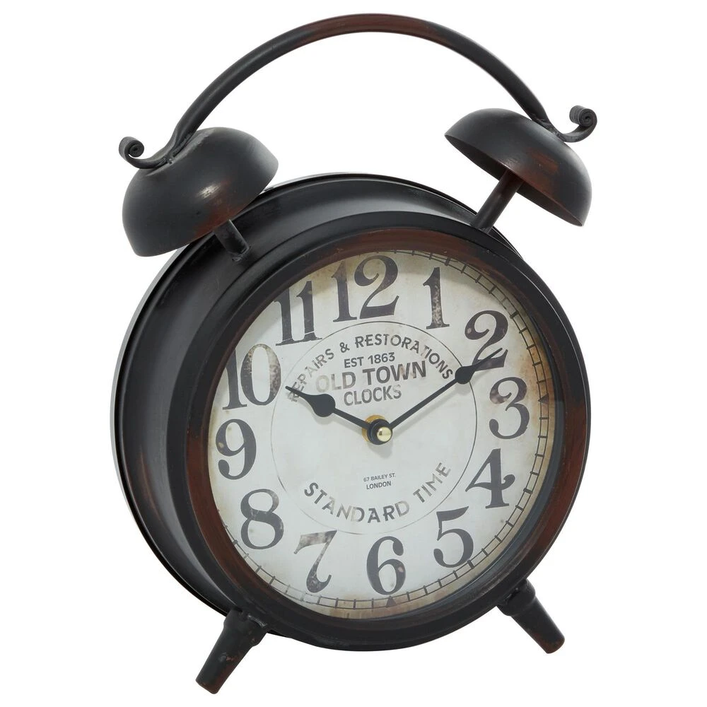 Improve your time management skills and keep a clock close by with this charming piece. A dashing display on any surface to help you manage your time throughout the day. Placed on your console or coffee table, this table clock is sure to be a timeless addition to your home or office. Designed with black rubber stoppers at the base that prevent scratching furniture and table tops, as well as sliding around. Requires 1 AA battery. Battery not included. This item ships in 1 carton. Features Arabic numerals for the hour markers. The clock mechanism runs silent. Suitable for indoor use only. Vintage inspired. With faded “Old Town Clock” print on its face..