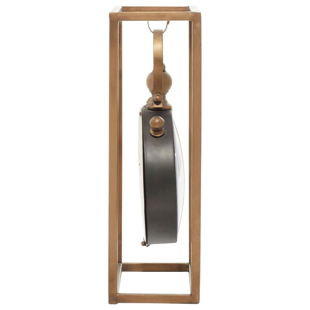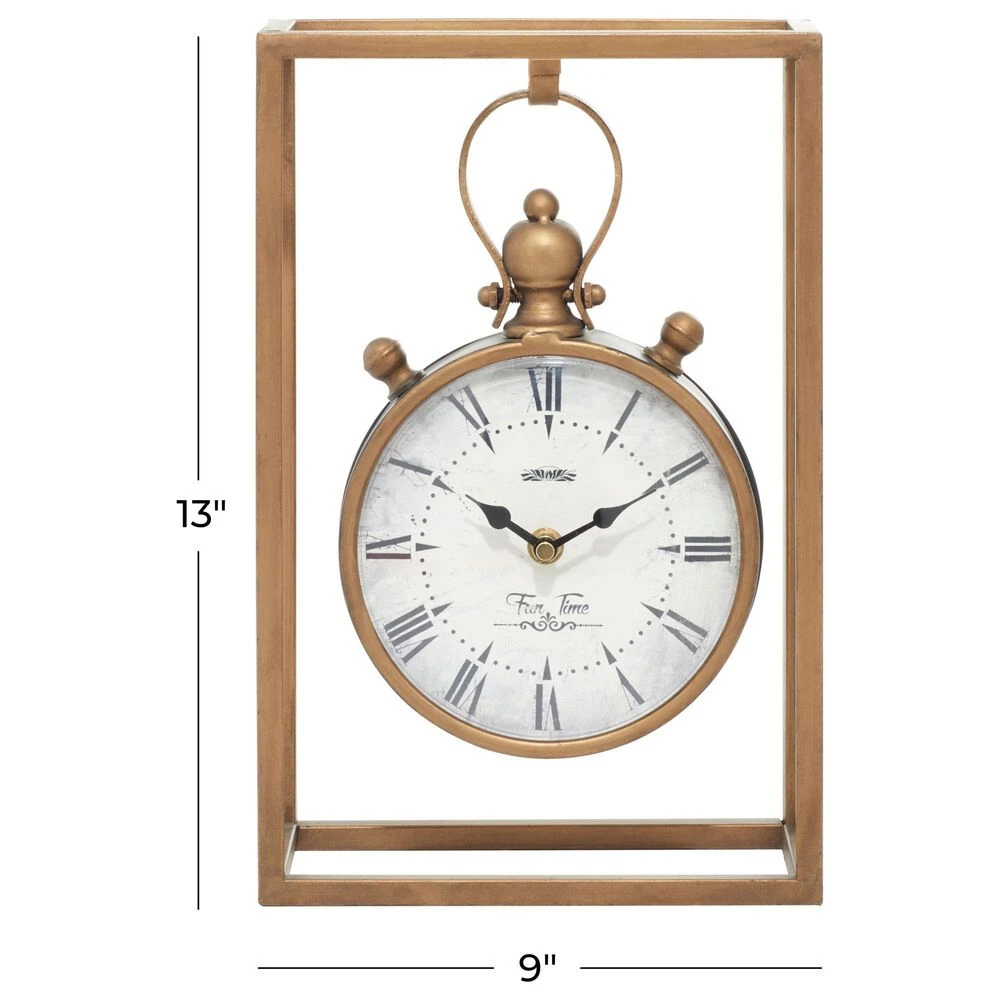 Improve your time management skills and keep a clock close by with this charming piece. A dashing display on any surface to help you manage your time throughout the day. This vintage table clock will make an amazing centerpiece on your living room when displayed on tables or surfaces and paired with ,matching Decor. Designed with black rubber stoppers at the base that prevent scratching furniture and table tops, as well as sliding around. Requires 1 AA battery. Battery not included. This item ships in 1 carton. The clock face features a distressed white finish with black Roman numerals and clock hands. The clock mechanism runs silent. Suitable for indoor use only. Vintage inspired.