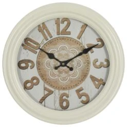 Maximize your wall space to create depth and balance with farmhouse inspired clock. Requires 1 AA battery. Battery not included. This item ships in 1 carton. Arabic numerals for the hour markers. The clock mechanism runs silent. Metal secure loop backing for easy hang; nails and screws are not included. Suitable for indoor use only. Farmhouse-styled style.